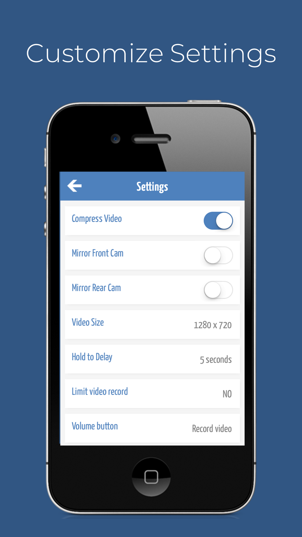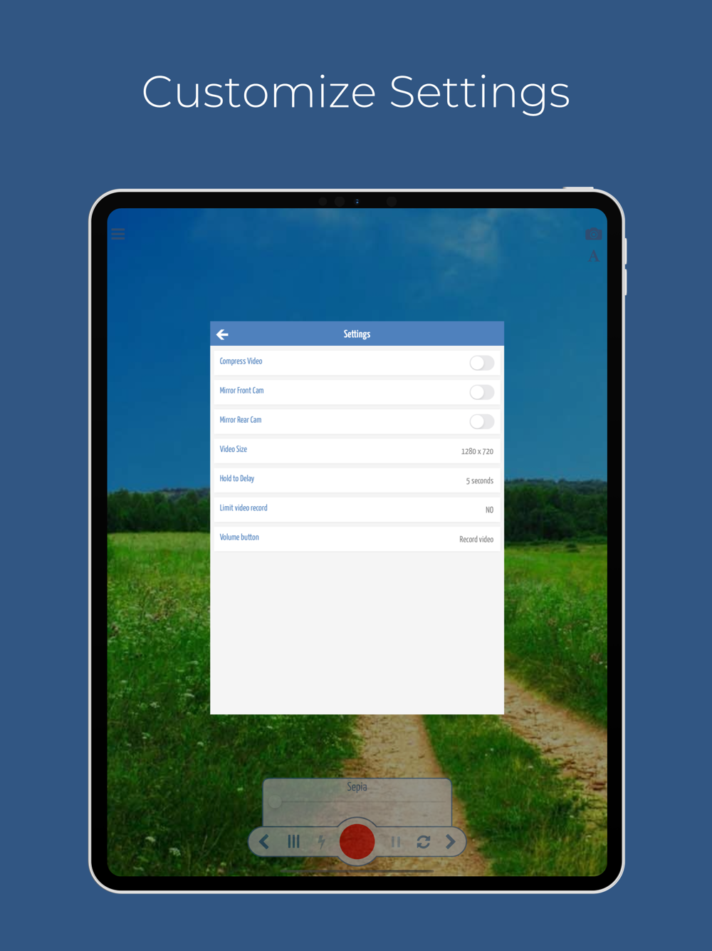 - options: compress video, flip cameras, video size, limit record, delay record/snap.