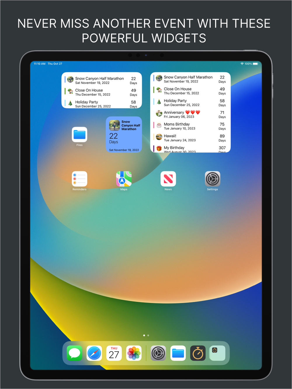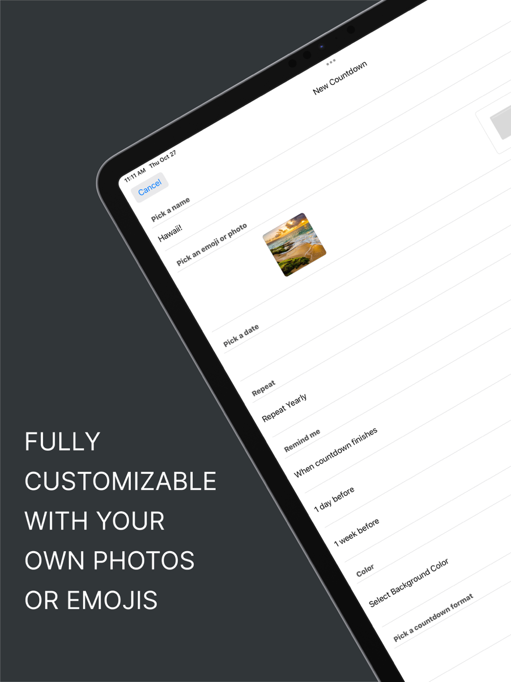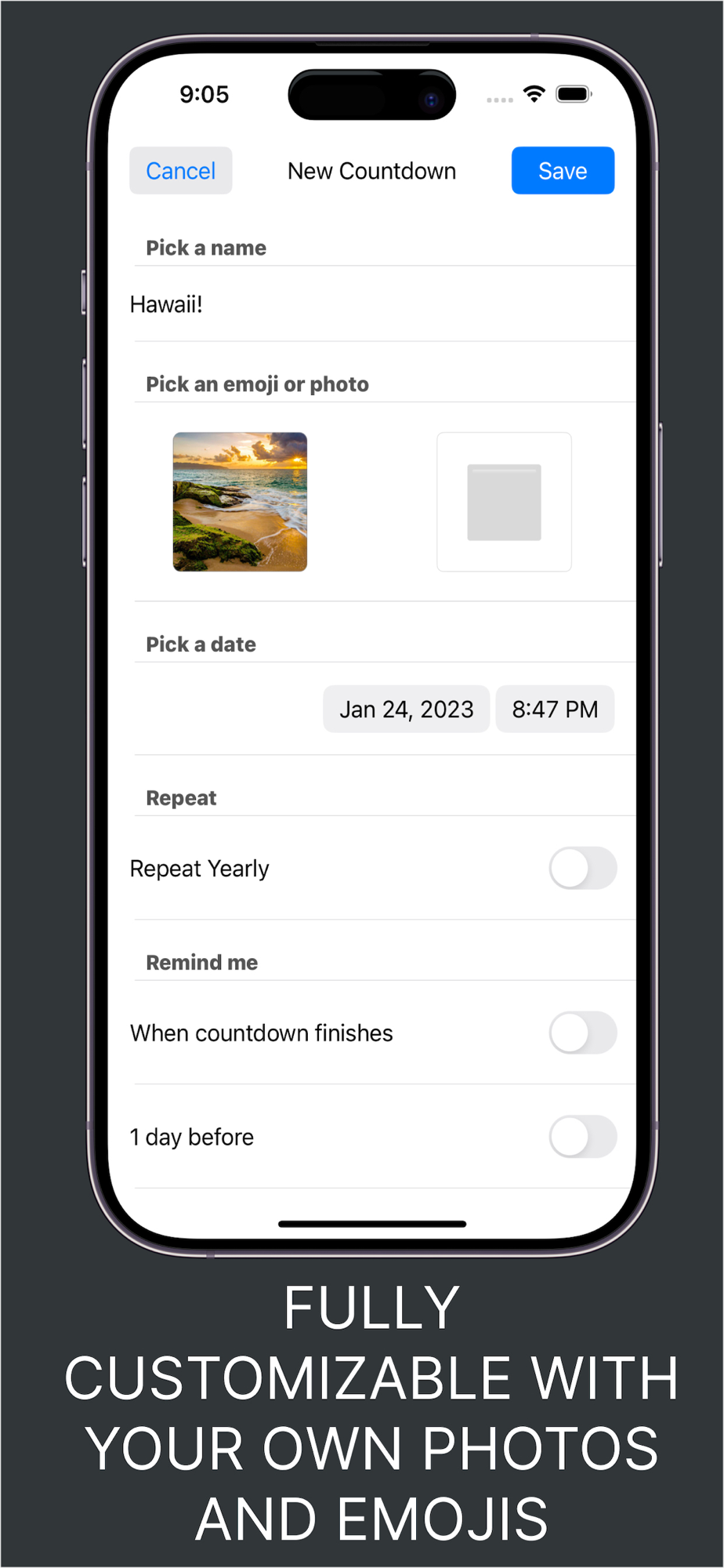 Never again be unprepared for upcoming events. Be it birthdays, marathons, anniversaries, sports events, launches, parties etc. With this simple yet powerful app you will become the master of time.