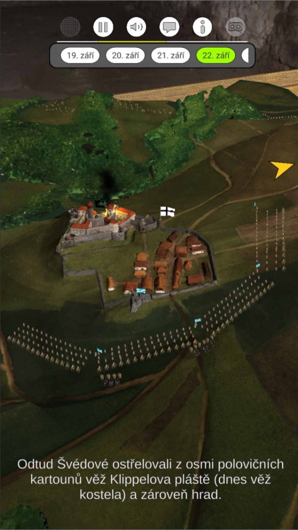 Aplikace znázorňuje scénář bitvy v období 30. leté války, kdy na hrad Sovinec zaútočily švédská vojska. Model hradu lze v rozšířené realitě položit do prostoru a poté se k němu různě přibližovat a pouštět si jednotlivé dny dobývání.