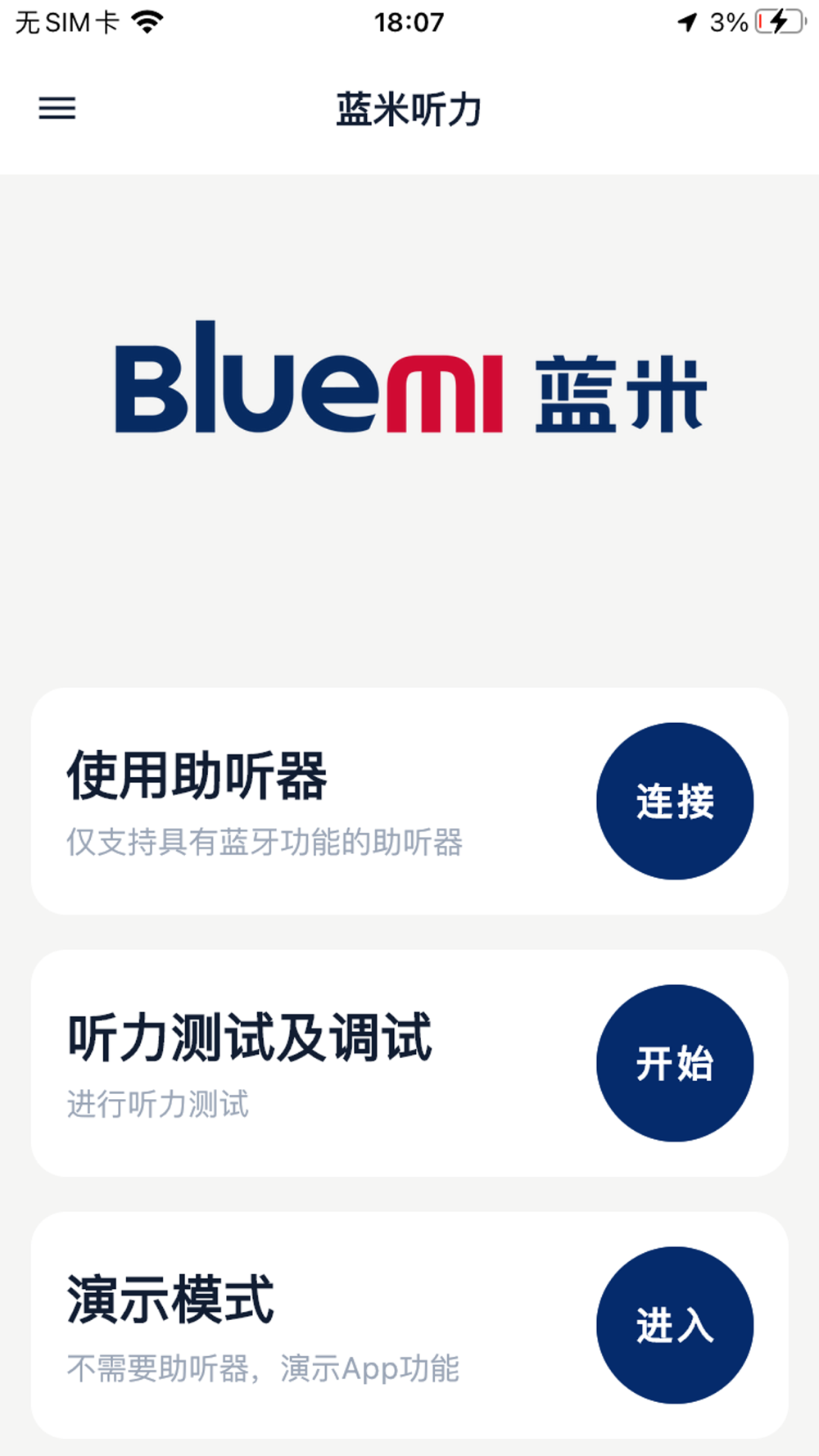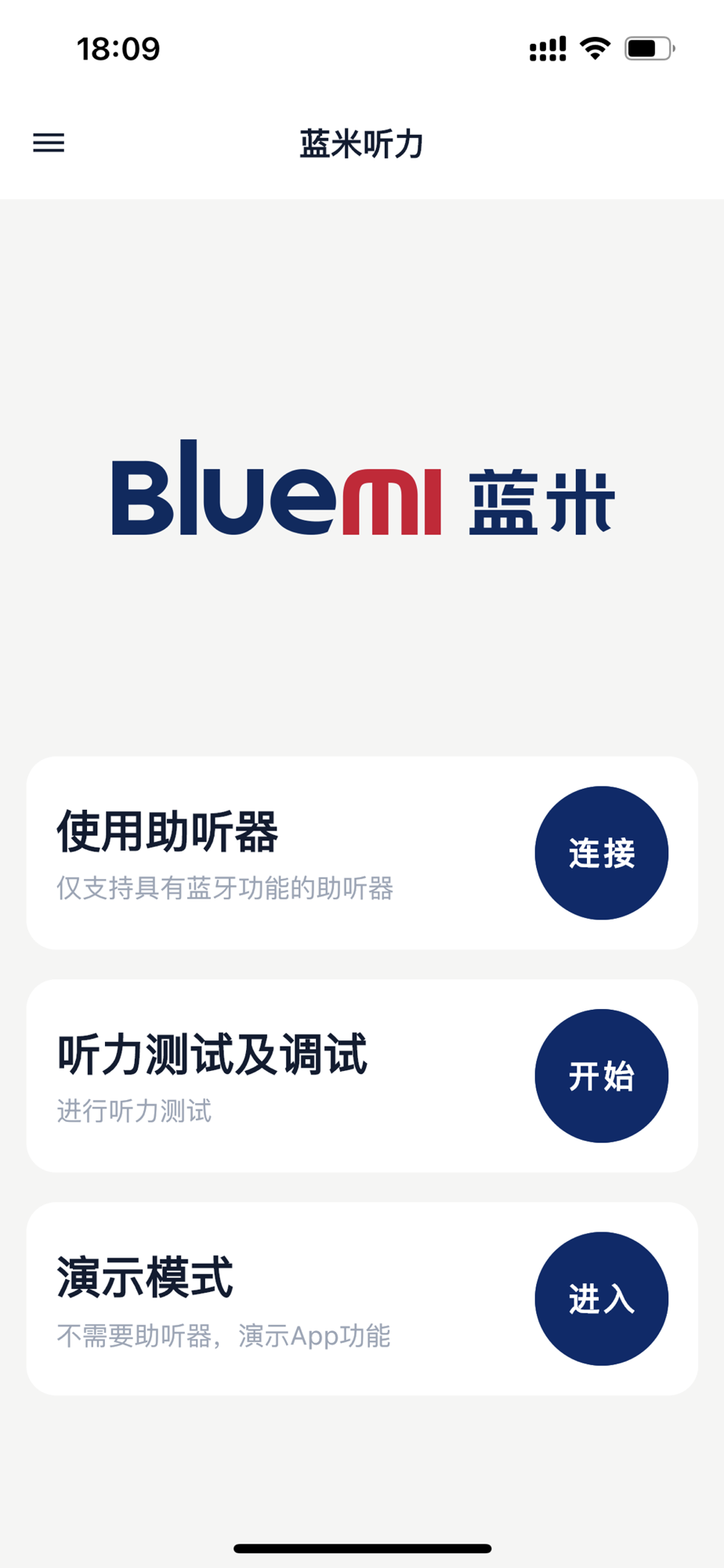 蓝米听力验配软件搭载助听器,可通过该应用检测个人听力情况,推荐最佳听力方案,如对系统推荐听力方案不满意,仍可手动微调订制属于您的听力方案,可随时设定助听器预设模式、音量等参数,可检测助听器状态、电量、音量等情况。