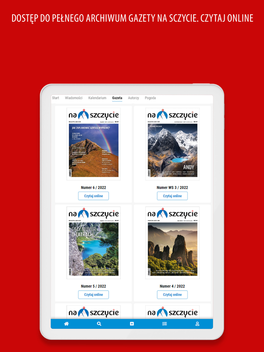 Magazyn Na Szczycie to relacje z gór wysokich, rodzimych szlaków, wypraw bliskich i dalekich. Począwszy od tatrzańskich czy beskidzkich wędrówek, aż po alpejskie szczyty i himalajskie lodowce. Każdy numer uzupełniają inspirujące wywiady, testy sprzętu, galerie i praktyczne poradniki. A także recenzje książek o tematyce górskiej, felietony oraz reportaże z ekspedycji w najodleglejsze pasma górskie. Czasopismo tworzone jest przez ludzi gór, ekspertów i czytelników dla wszystkich górskich pasjonatów.