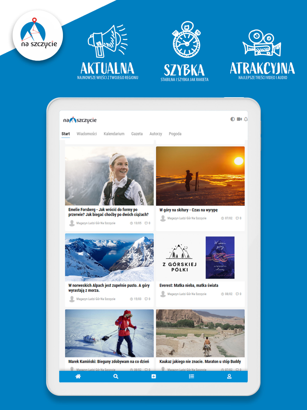 Nasze teksty kierujemy do osób kochających góry, szlaki, wspinaczkę i każdą formę aktywnego wypoczynku nad poziomem morza. W Polsce i za granicą. Od trekkingu, przez alpinizm, aż po weekendowy spacer z rodziną. Rozmawiamy z himalaistami, oddajemy głos podróżnikom i testujemy z nimi górski ekwipunek. Jesteśmy wszędzie tam, gdzie można dojść, dobiec i dojechać na rowerze. To nasza pasja. Chcemy Was zachęcić, natchnąć i wskazać kierunek do zdobywania kolejnych szczytów. Wyżej, dalej, za horyzont. O tym piszemy.