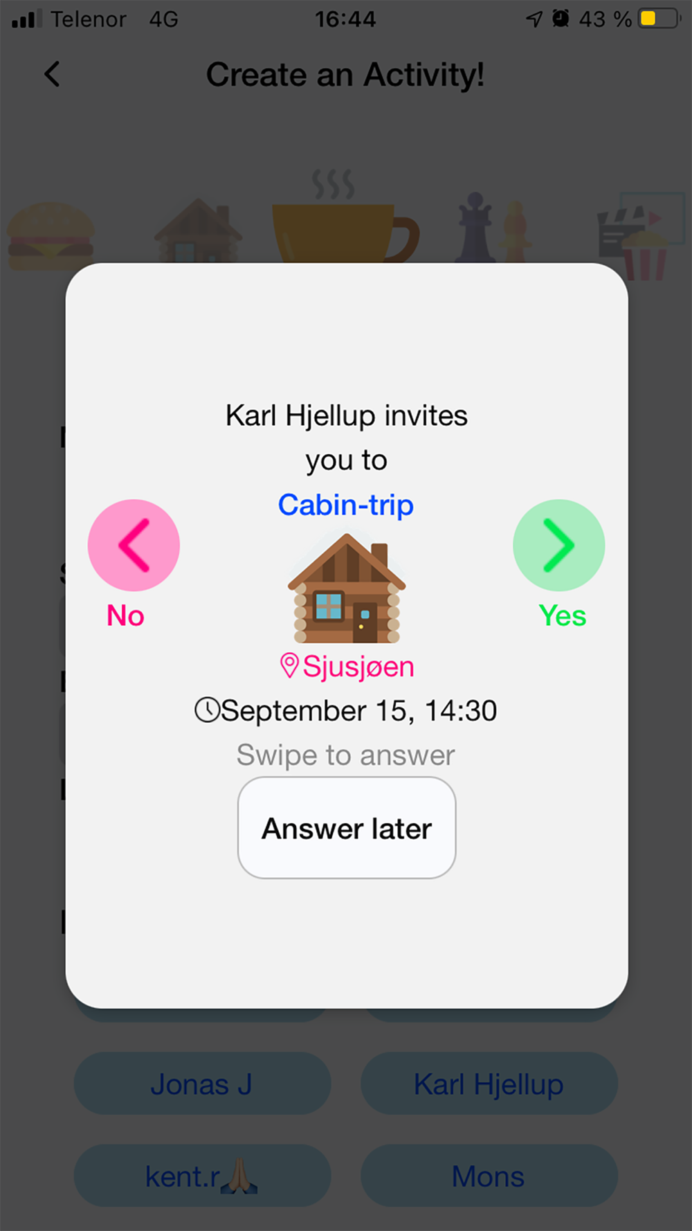 Open & Private Events: Customize your experience by choosing between open events, visible to everyone, or more private outings exclusively for your chosen few. Have an event in mind? Create it! Want to explore? Swipe in!