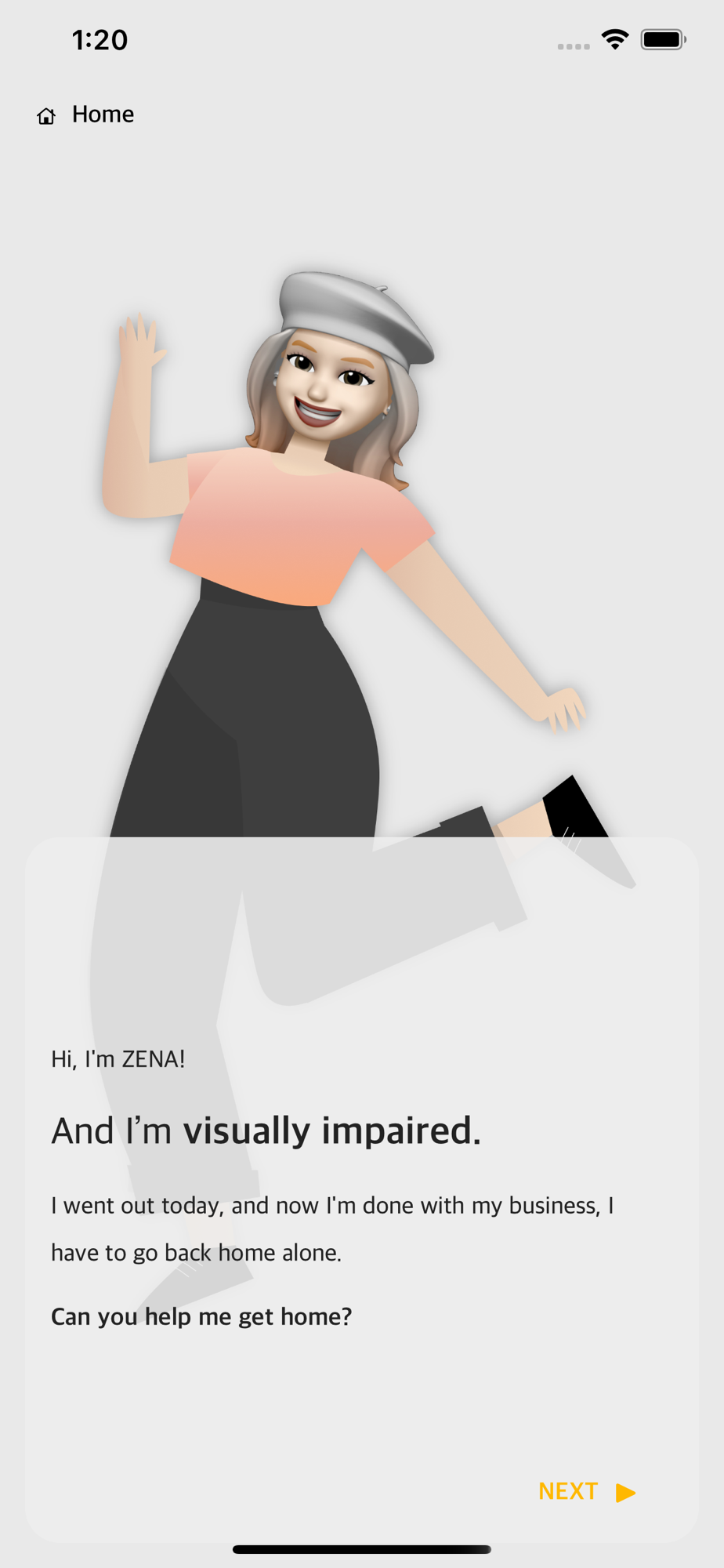 시각장애인 제나의 귀가하는 길을 함께하며, 제나가 평소 자주 처하는 곤란한 문제들을 함께 해결해 주세요