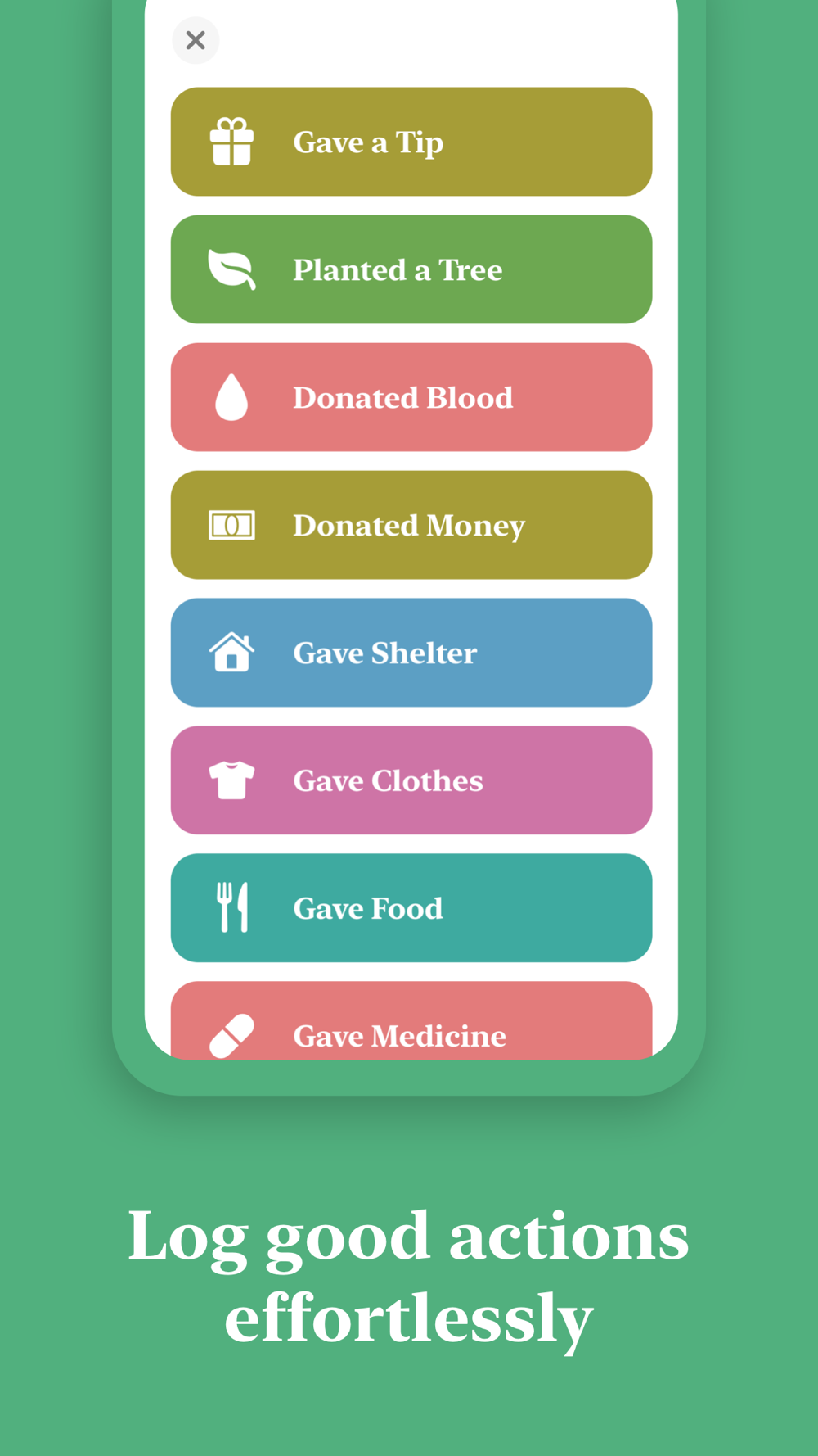 1. Log Your Good Actions: Effortlessly record your good actions within the app from a list. From small acts of kindness to significant charitable contributions, track your positive actions with ease.