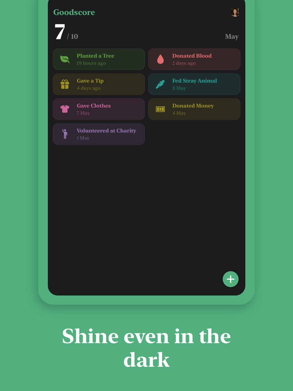 Whether it's acts of kindness, charitable donations, volunteering, or any other positive action, Goodscore provides a convenient platform to record and monitor your progress. Stay motivated and accountable as you work towards your goals of making a difference in your community.