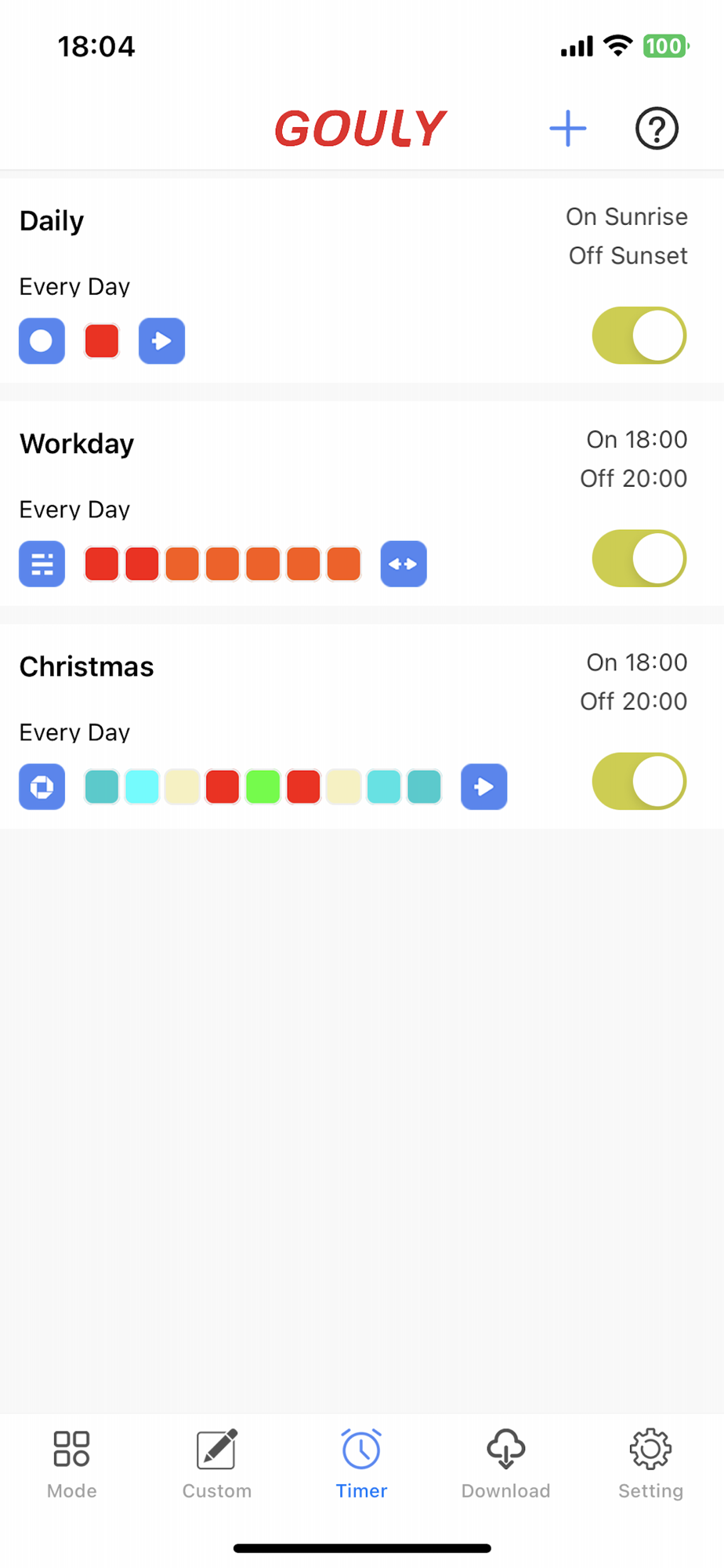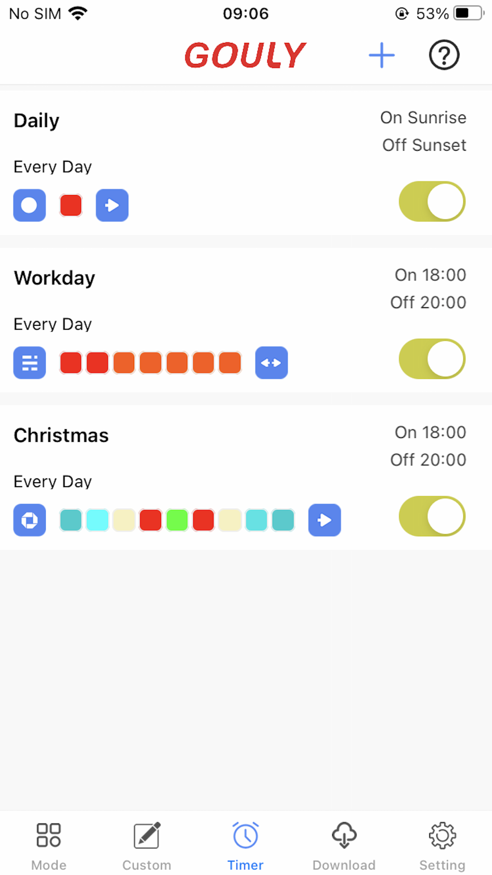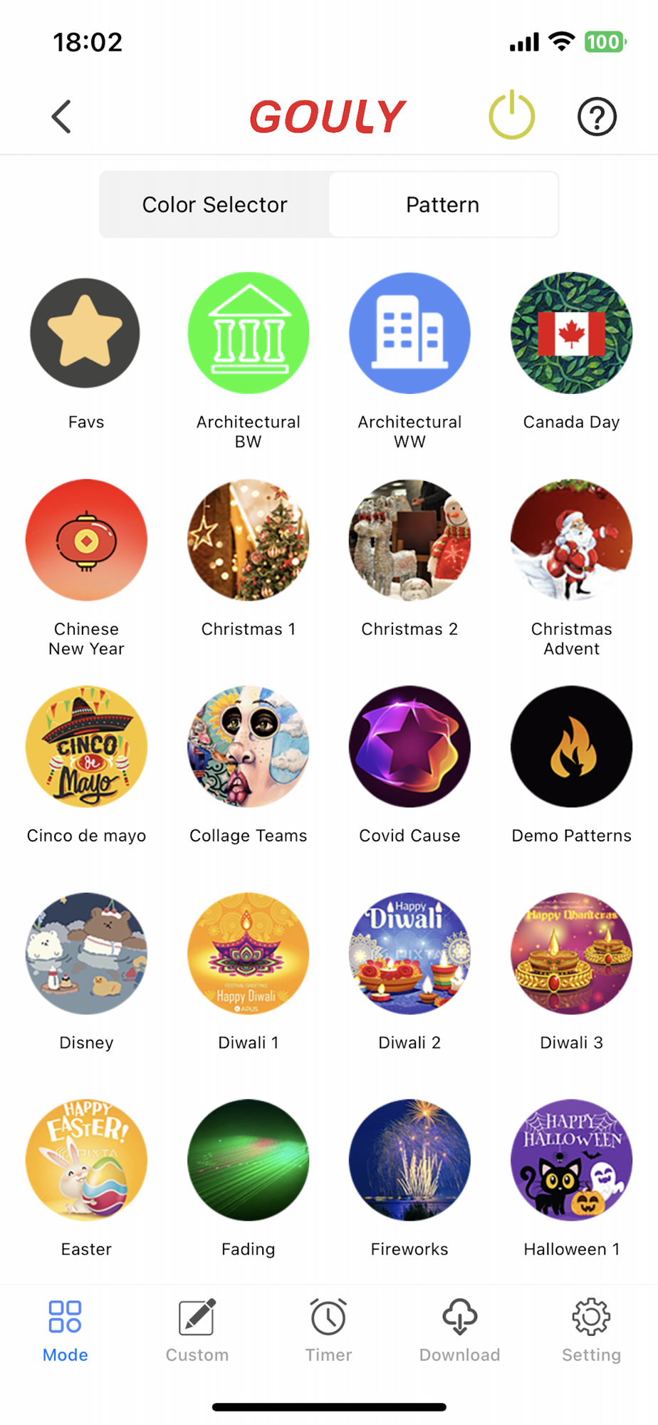 Gouly Lighting is a smart app with multiple functions,connected via Bluetooth or WIFI. It has 24 patterns and 52 holiday patterns .The app mainly includes music control, voice control, timing setting,multi group control, device sharing, reset wifi ,firmware update ,etc. It is available for various IC type.The Users can edit their favorite holiday lighting effects according to their needs.