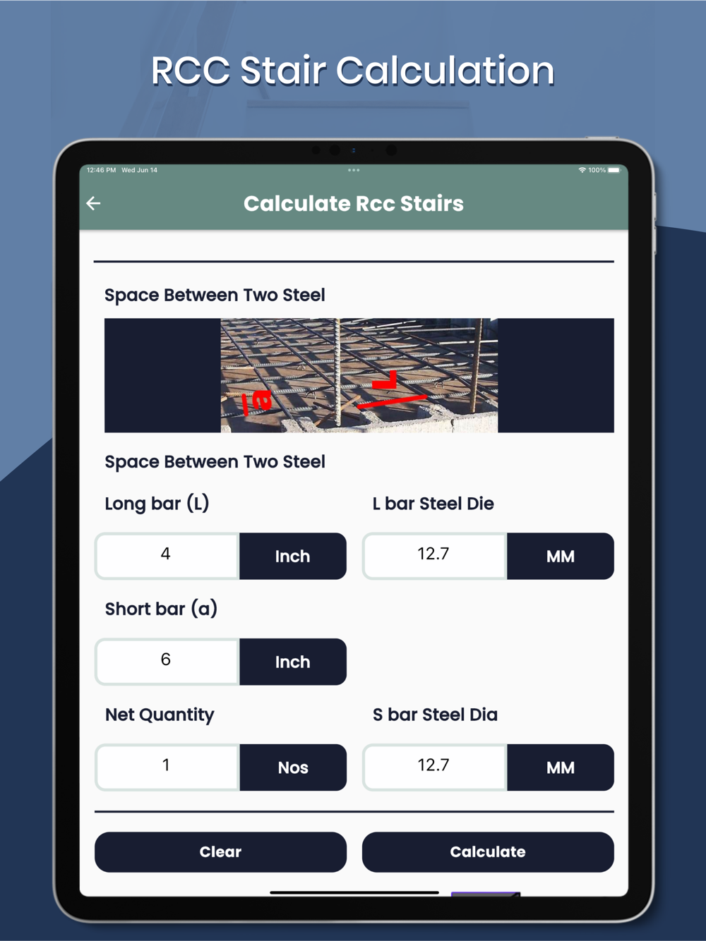 Material Estimation: The app assists in estimating the quantity of concrete, reinforcement bars (rebars), and other materials needed for the construction of the staircase. This feature helps in planning the project and optimizing resource utilization.
