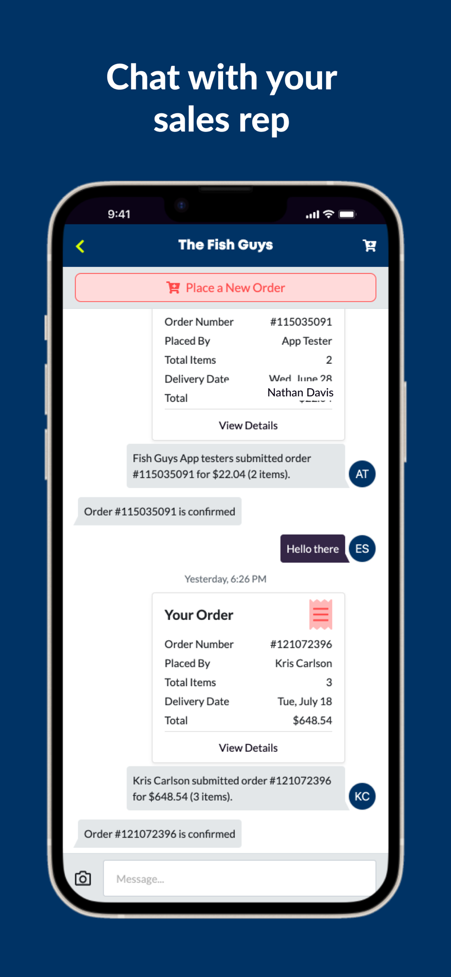 Stay connected with your sales rep and the The Fish Guys team through in-app chat.