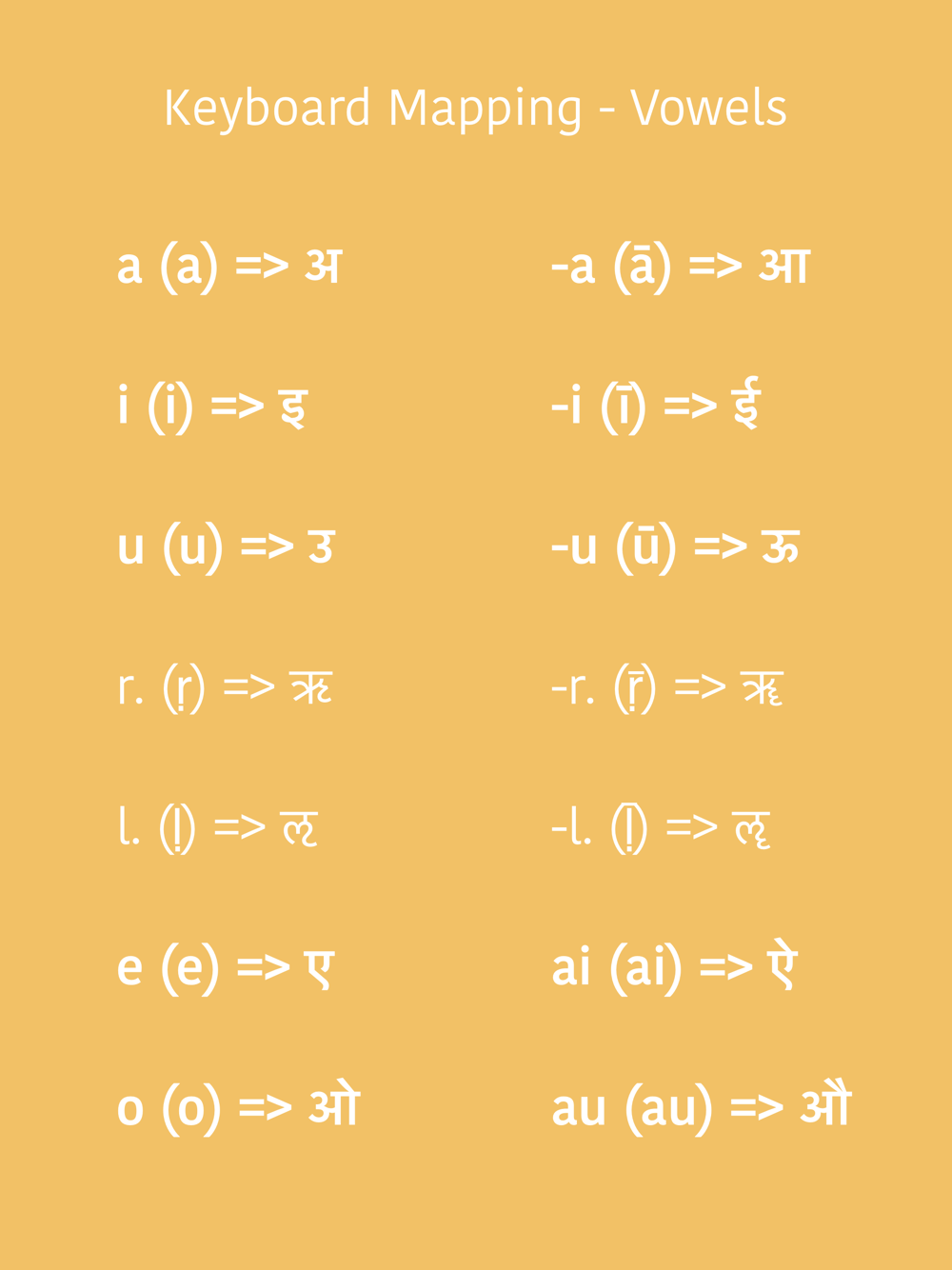 The Type Devanagari Keyboard allows you to use the current English keyboard you're already familiar with, with a few extra special keys, to type in Devanagari using IAST-inspired syntax. For example "ā" can be typed as "-a", with "आ" as the output, or "ṇ" can be typed as "n." with "ण्" as the output, making it very easy to use for those who know the IAST - Devanagari scripts. No need to memorize a whole new Sanskrit keyboard! Just use what you know.