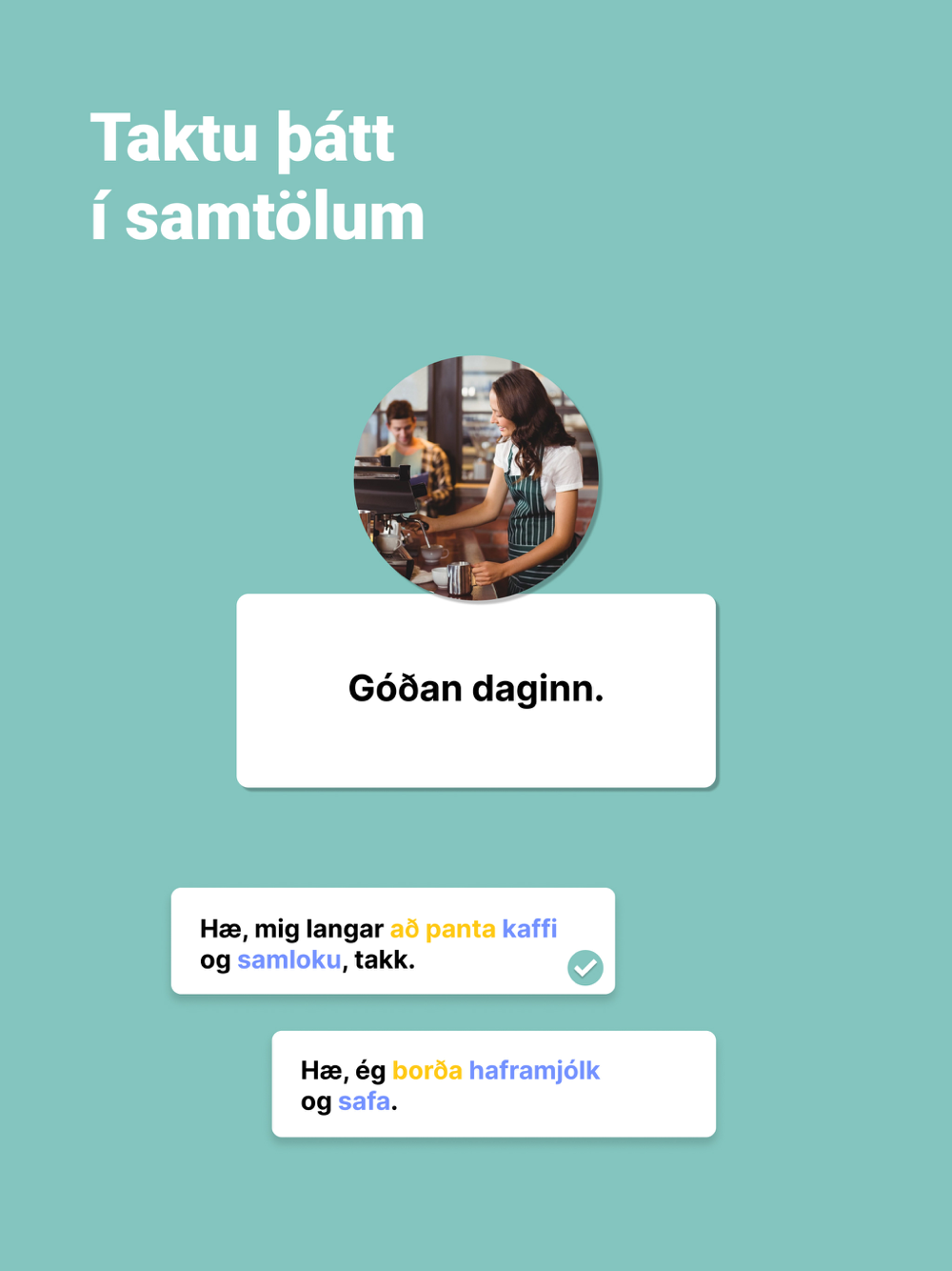 With this solution, users can practice conversations in a safe environment. The application can listen to users speak, exercise them in pronunciation, and offer feedback in real time. Included in the app are general courses and work-specific courses, tailored for each company. With Bara tala, you can practice Icelandic wherever and whenever.