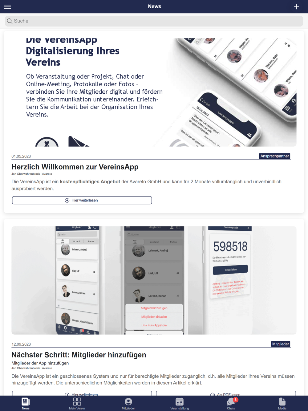 Organisieren Sie Ihr Vereinsleben vollumfänglich digital: Kommunikation von Neuigkeiten und Mitgliederzeitschriften, Verwaltung aller Mitgliederdaten, Erstellung von Projektgruppen, Organisation von Veranstaltungen mit Zu- und Absagen, Einzel-, Gruppen und Organisations-Chat, Bereitstellung von Dokumenten, öffentliche Fotopinnwand und vieles mehr ...