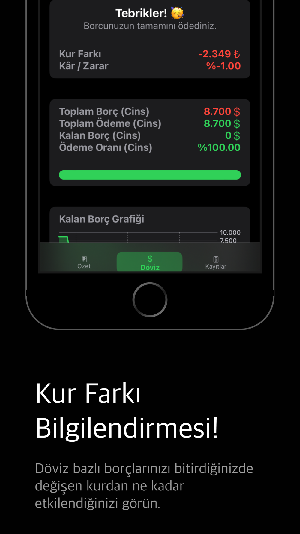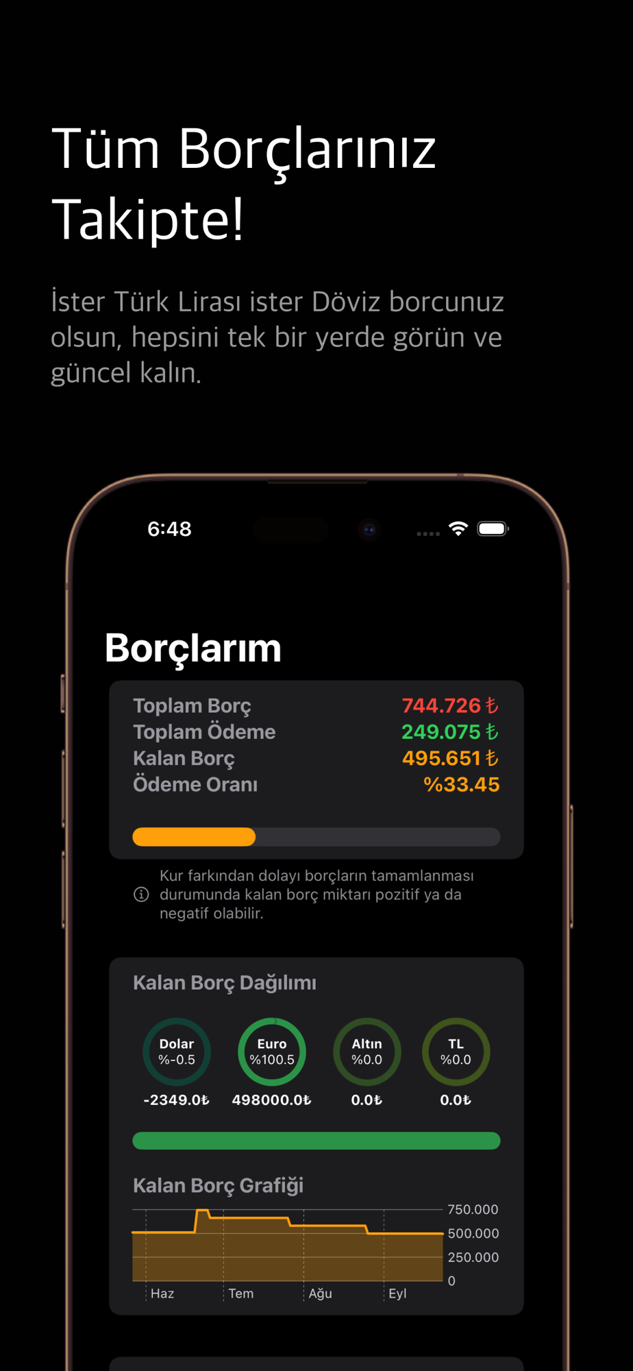 Grafiksel Borç Analizi: Borçlarınızın ne kadarını hangi döviz cinsinden ödemeniz gerektiğini kolayca görün.