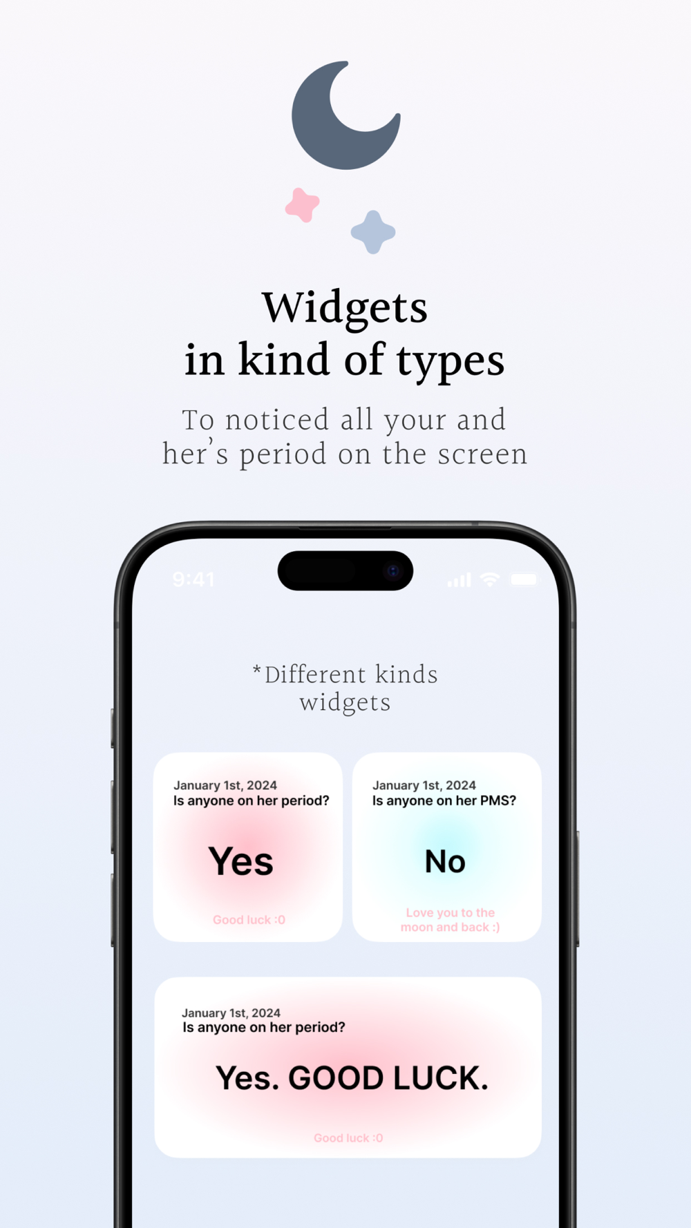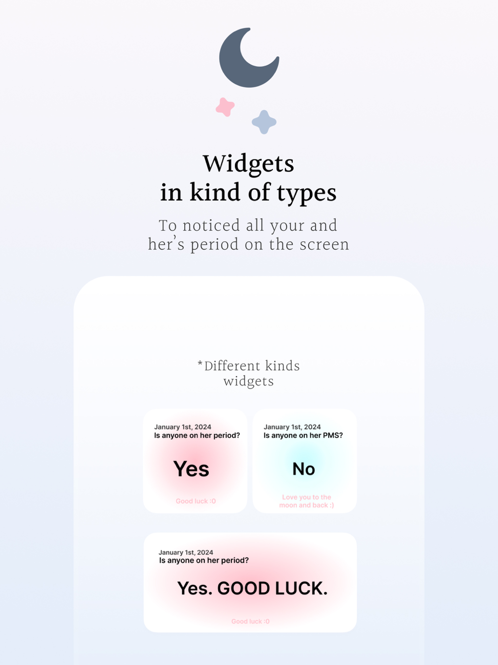 - Desktop widgets: A variety of desktop widgets to learn about the cycle status of you and your female relatives and friends on the home screen