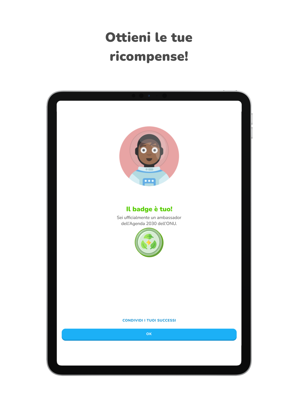 Competi con i tuoi amici e la community globale per conquistare il primo posto nella classifica, vincere premi e badge che attestano il tuo impegno, e diventa un vero e proprio eroe dell'Agenda 2030!