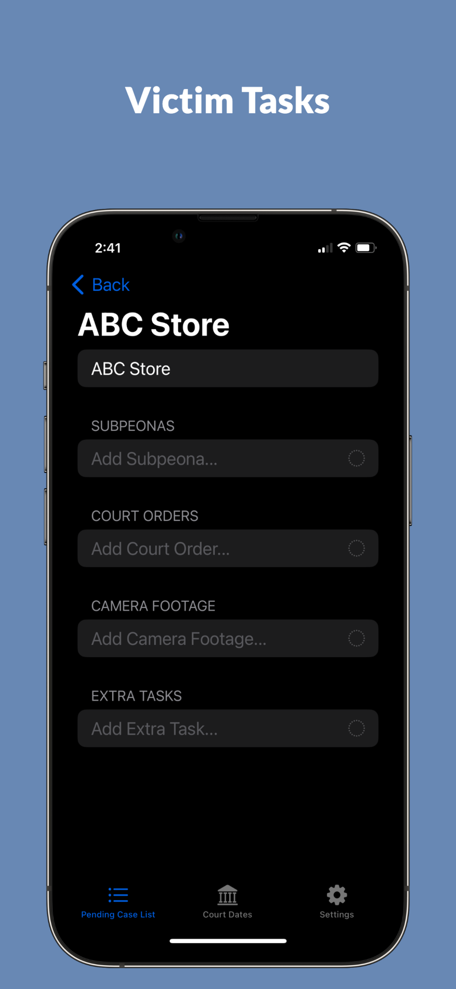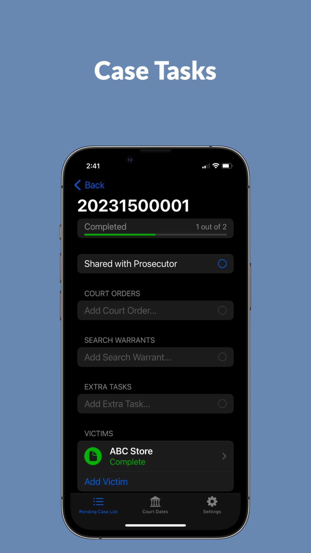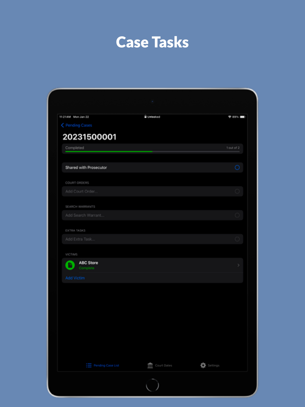 As a background, this app was developed in conjunction with retail theft detectives, where multiple stores (victims) can be involved in a single case. It soon became apparent that not only detectives, but also all busy officers could benefit from this organizational tool when preparing their cases. Gone are the days of scribbling to do notes, and marking them off hoping you don’t miss an important task and blow your case!