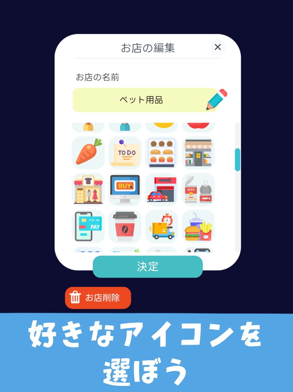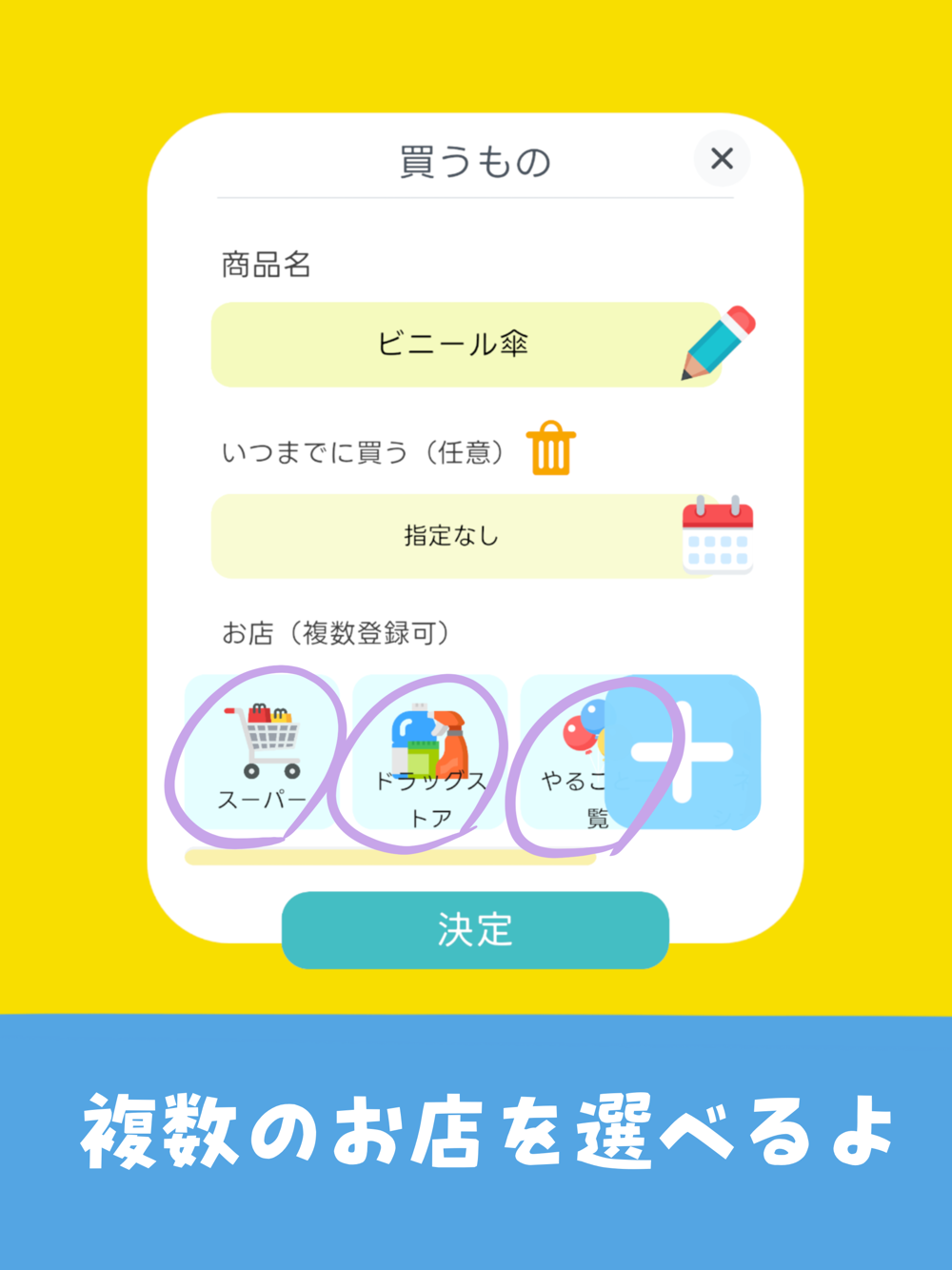 詳細設定: 物品に対して、カテゴリ、購入期限、お店(複数可)を設定可能。