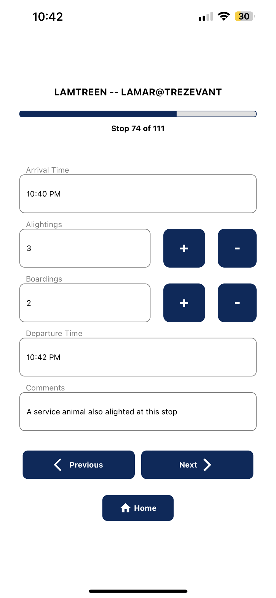 RideCheck App is a tool to assist public transit agencies with organizing passenger ridership for use in the TransTrack Manager. The app allows the surveyor to add and remove riders from a trip to accurately report the number of riders on the bus.