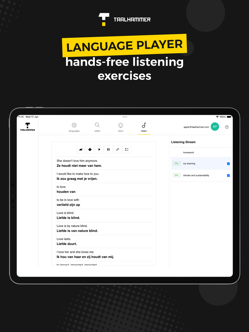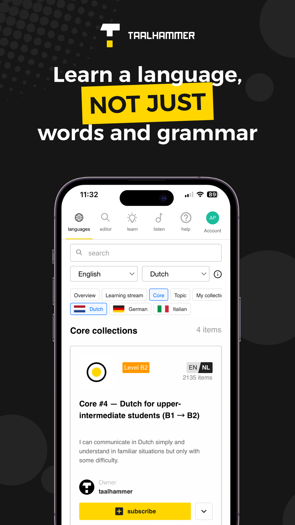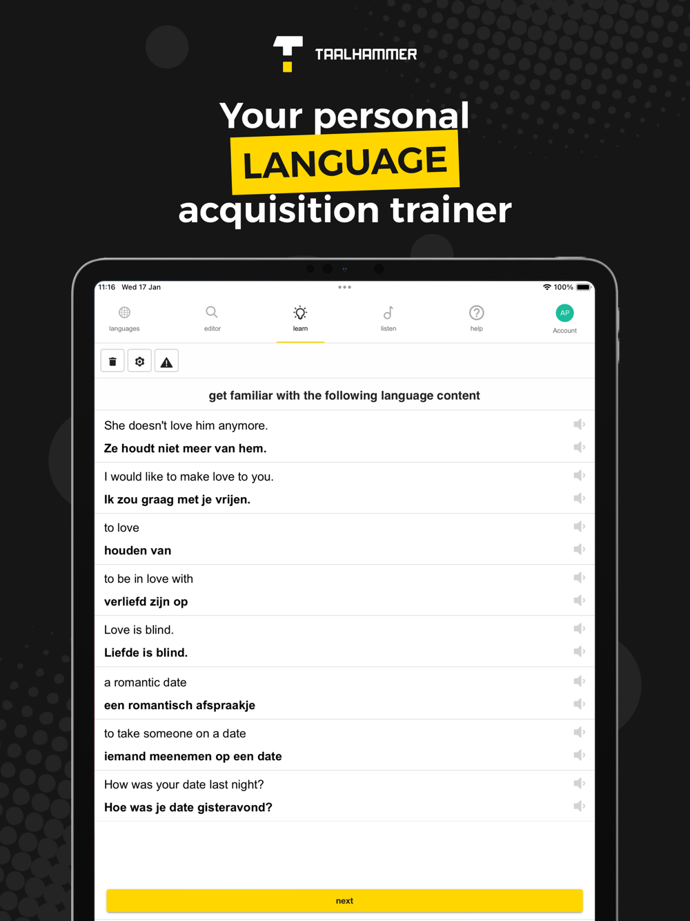 Taalhammer is your personal language acquisition trainer. Created out of passion for language learning. Backed up by science, powered by AI technology and verified by experience. Join us in our mission!