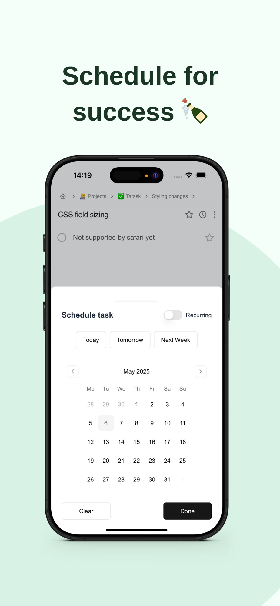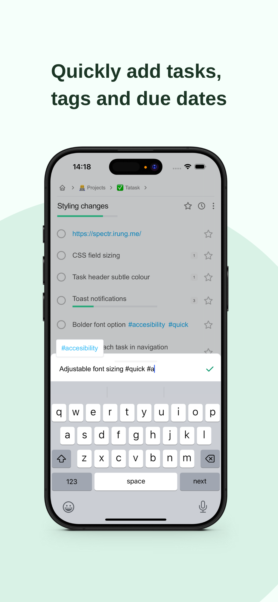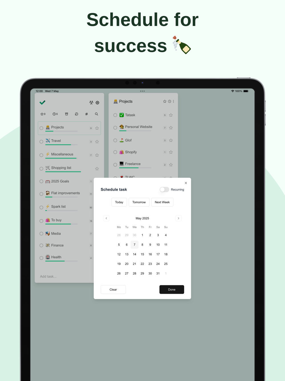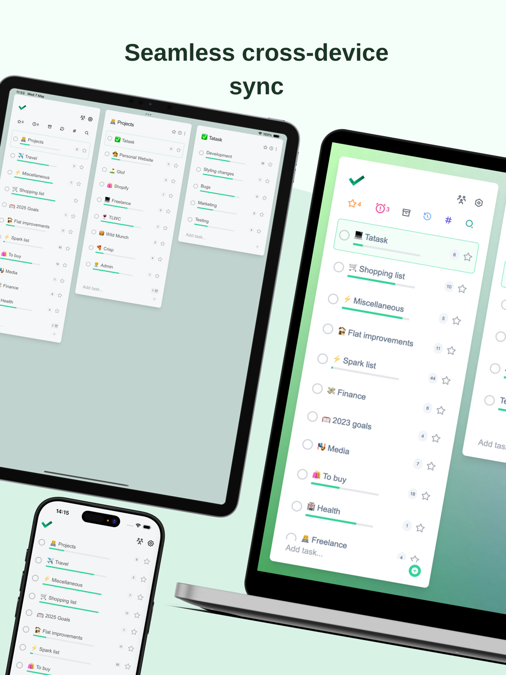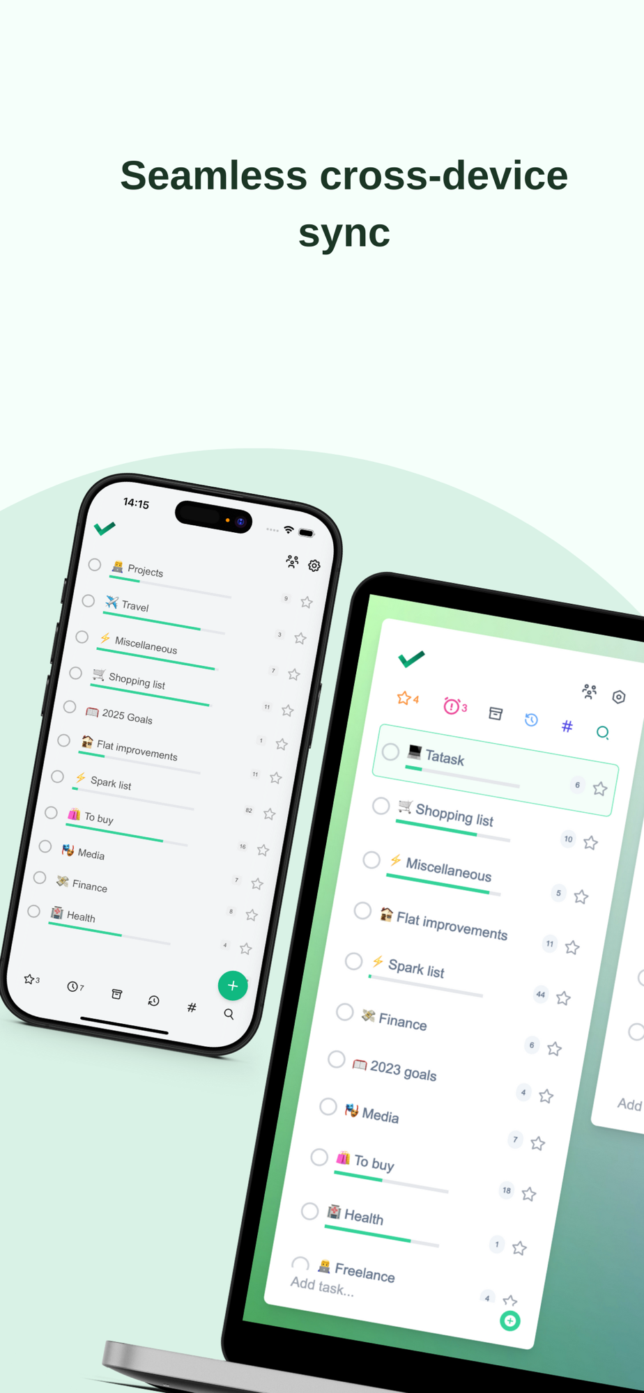 Work seamlessly on iOS and the web. Tatask syncs everything in real time, or if you're offline it will update as soon as you regain internet.