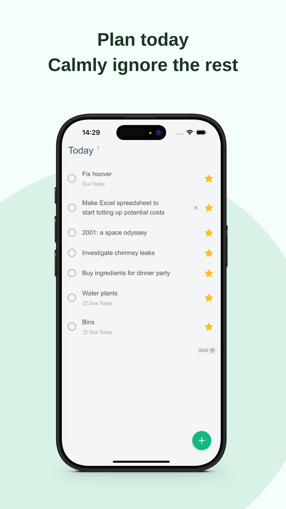Favourite tasks from any branch of your task tree in 1 tap to quickly make a to-do list for the day. Everything else is out of sight and out of mind to give your brain the space to focus on what's important.