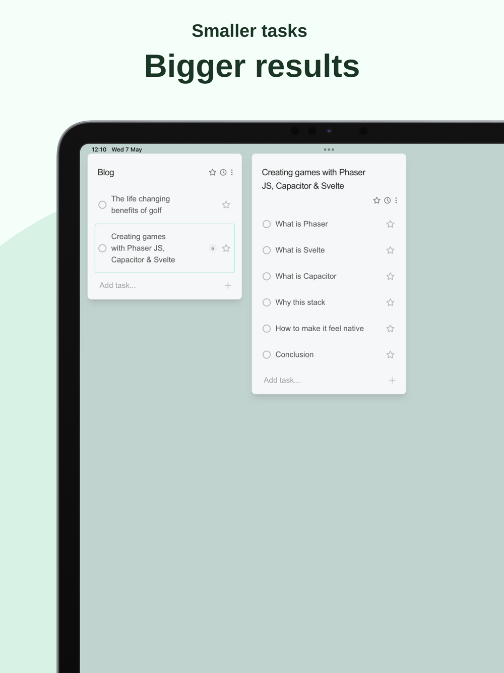 Nest your tasks into subtasks and beyond like the folders on your computer so you can compartmentalise everything and focus on what's important.