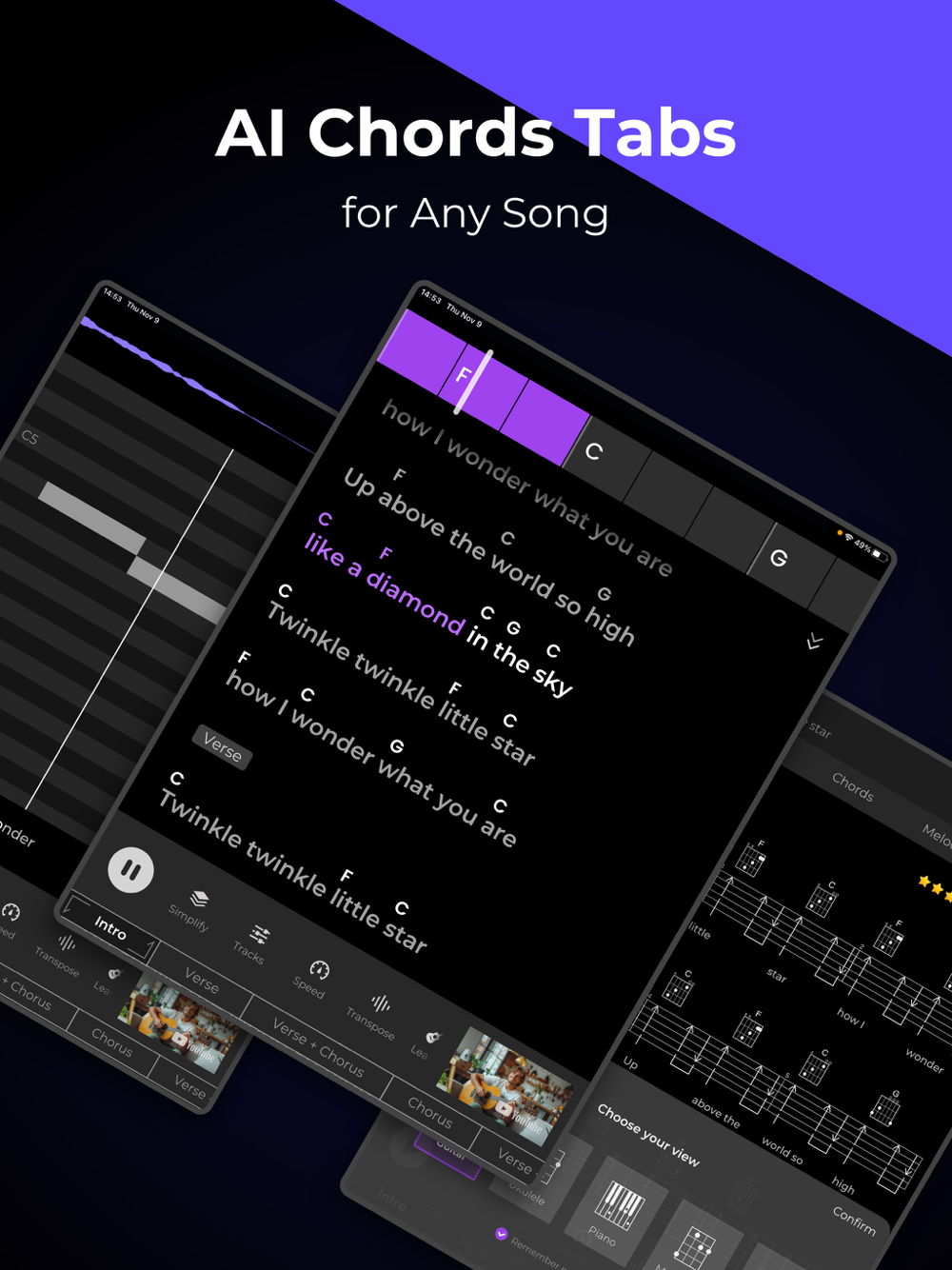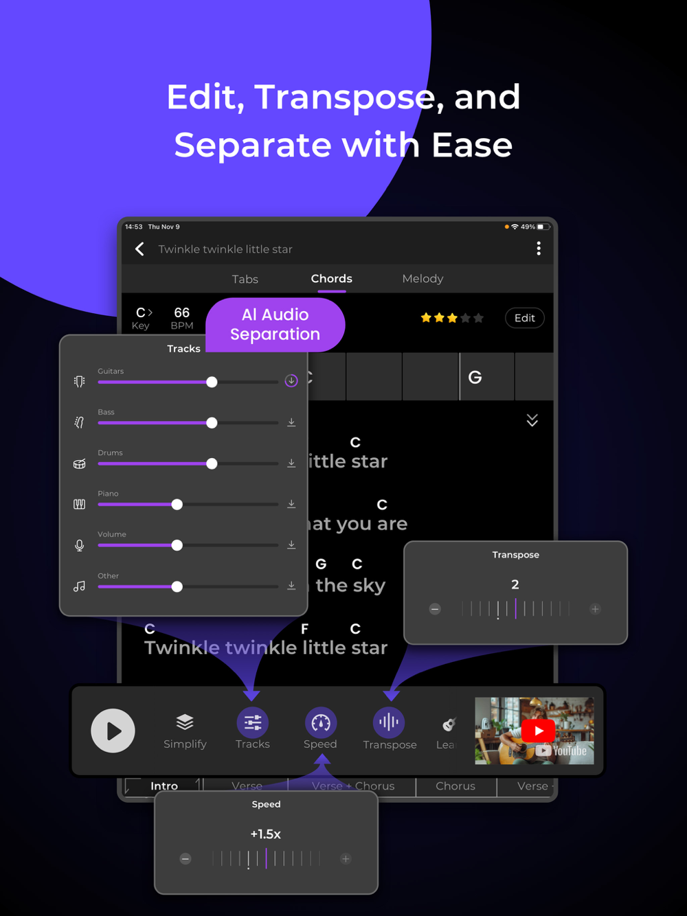 Accurately extract chords, tabs, melodies, and lyrics from any song, and edit with ease. Transpose and separate tracks effortlessly. Enjoy synchronized play of chords, lyrics, and video. Features include standard Transpose, Smart Transpose (real-time pitch shifting for videos), AI real-time stem separation, Loop (looping selected sections of interest), Speed adjustment (speeding up or slowing down), and more. All functionalities operate in real-time synchronized playback with the video or audio you upload.