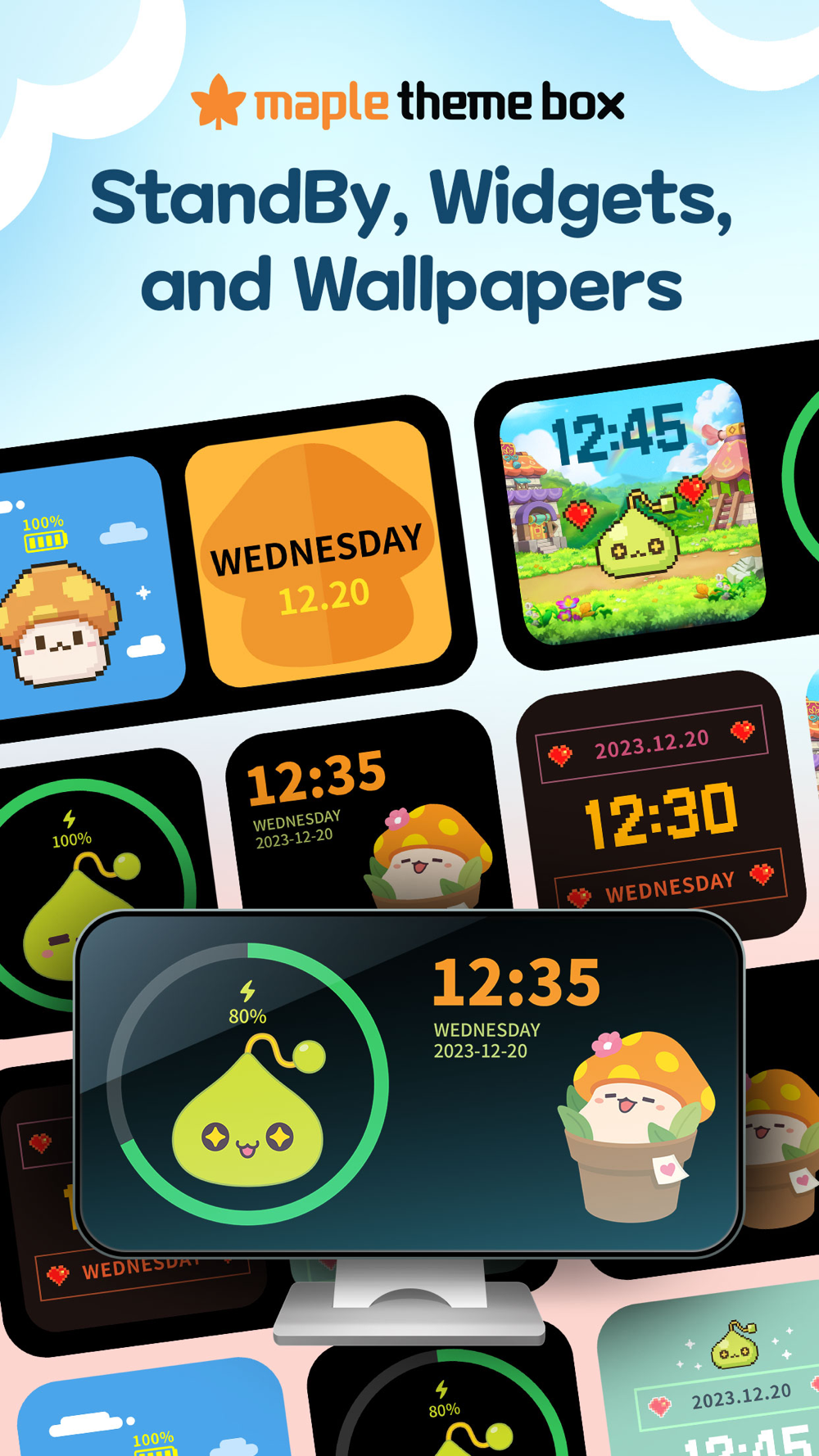 Discover dates, clock, battery percentage display and other essential widgets in MapleStory designs.