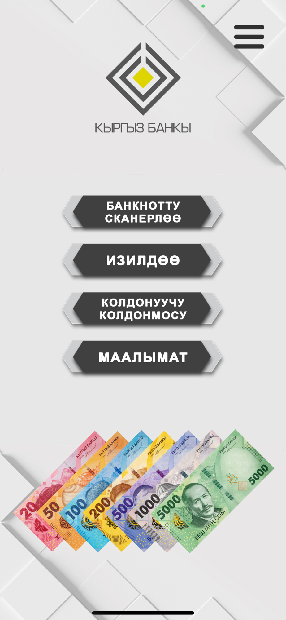 ПРЕДУПРЕЖДЕНИЕ! Мобильное приложение "Кыргыз сом" разработано исключительно в целях ознакомления с защитными элементами кыргызских банкнот образца 2023 года. Приложение не проверяет и не устанавливает подлинность банкнот.