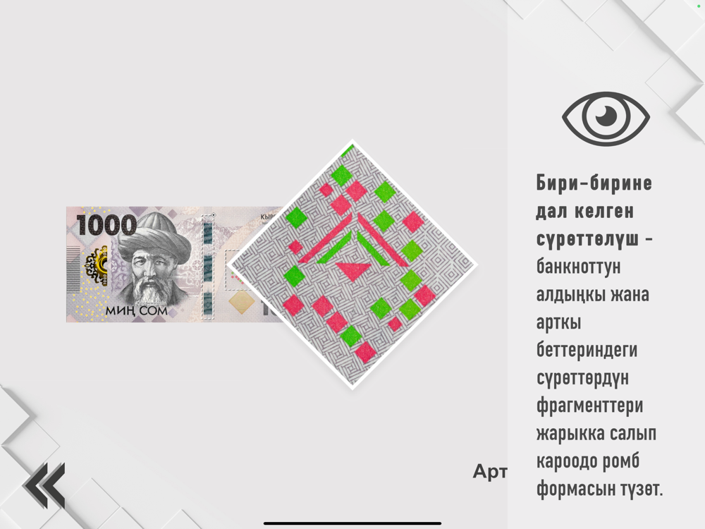 Приложение "Кыргыз сом" показывает как проверить защитные элементы банкнот при просмотре их на просвет, при изменении угла наклона и при использовании увеличительного стекла.