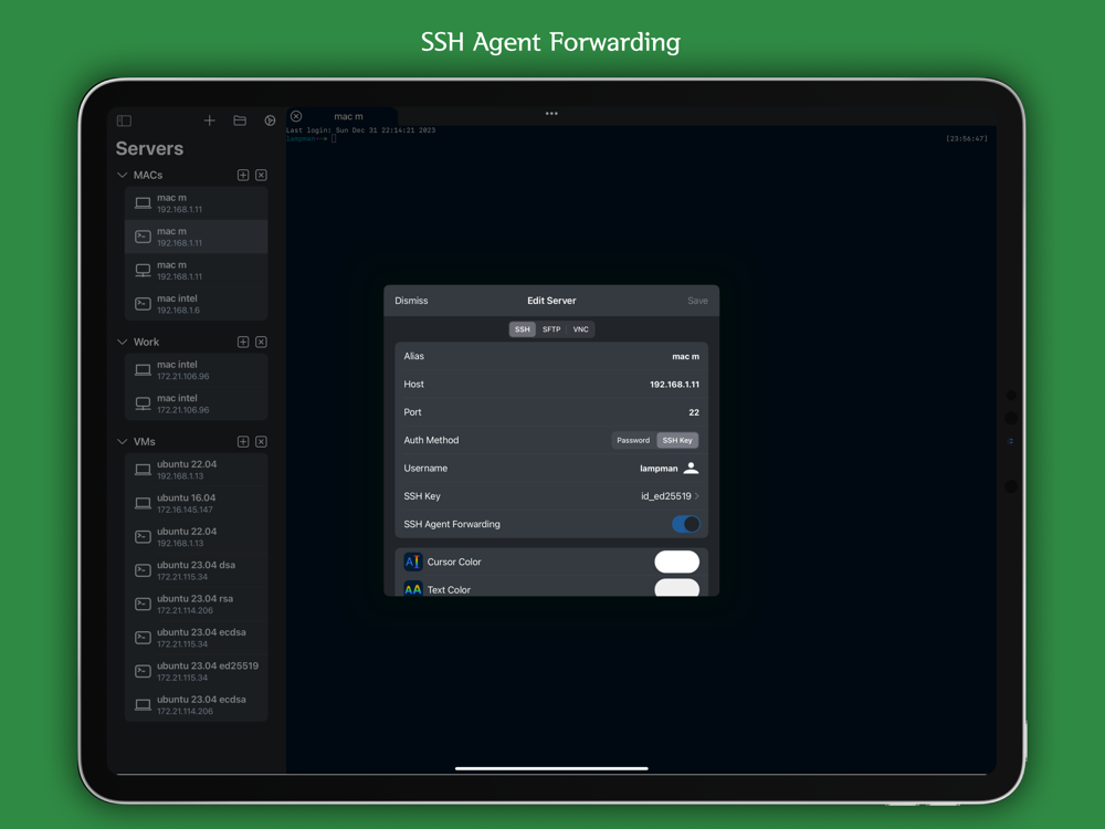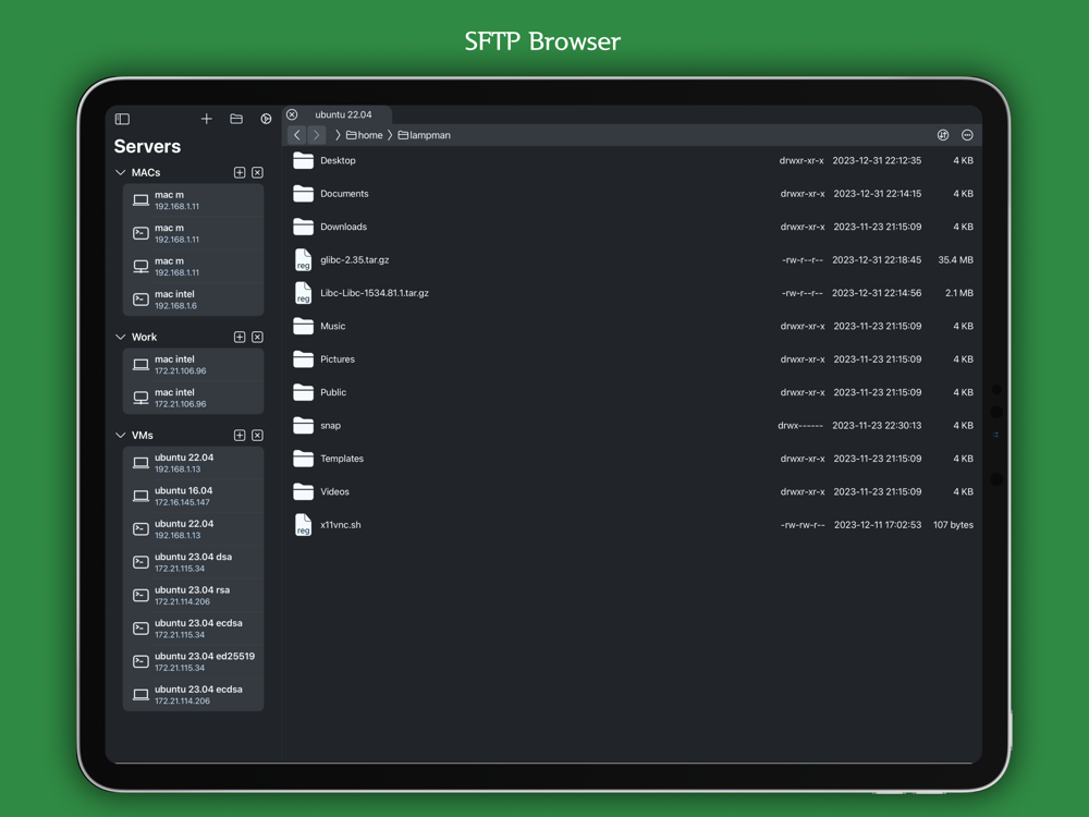 Seamlessly access and manage your servers with SSH, transfer files securely with SFTP, and take control of your desktop using VNC—all from the palm of your hand.