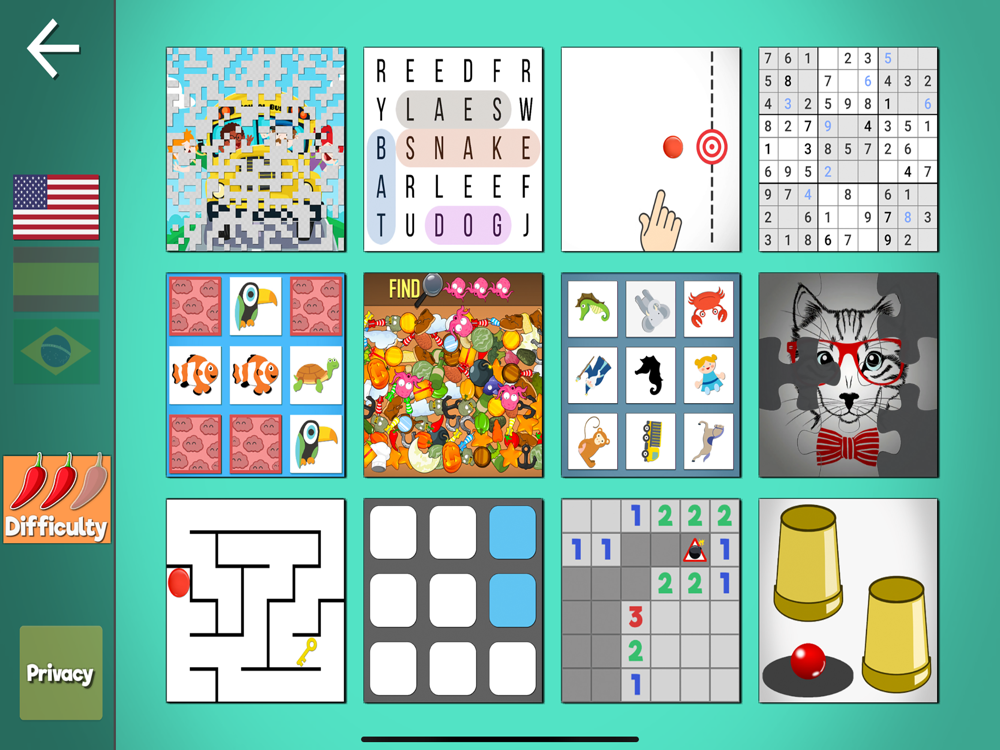 Enjoy 12 educational games to keep your mind active and have fun. Labyrinths, puzzles jigsaw, alphabet soup, games of wit, memory, mazes, visual acuity, spatial vision, minesweeper, sudoku, find objects ... and many more! In three languages, English, Spanish and Portuguese.