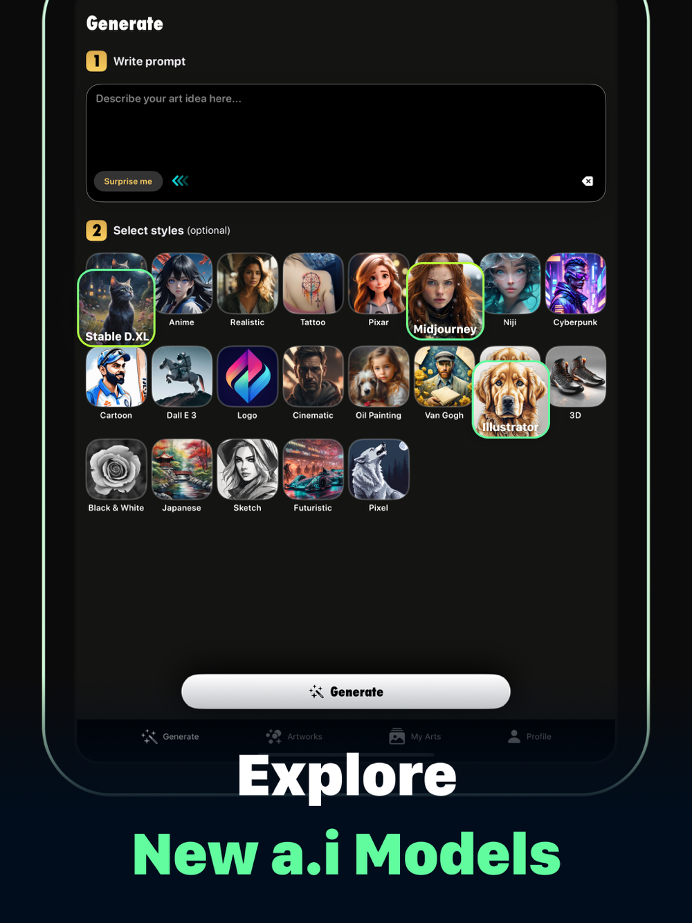 Generate AI art through the magic of text! Simply input your prompt, select an artistic style, and watch as AI Art crafts stunning wallpapers, images, paintings, and drawings for you in seconds!