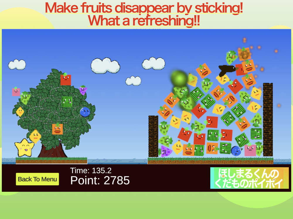 Hoshimaru(the star-shaped character) throws fruits that falling on.