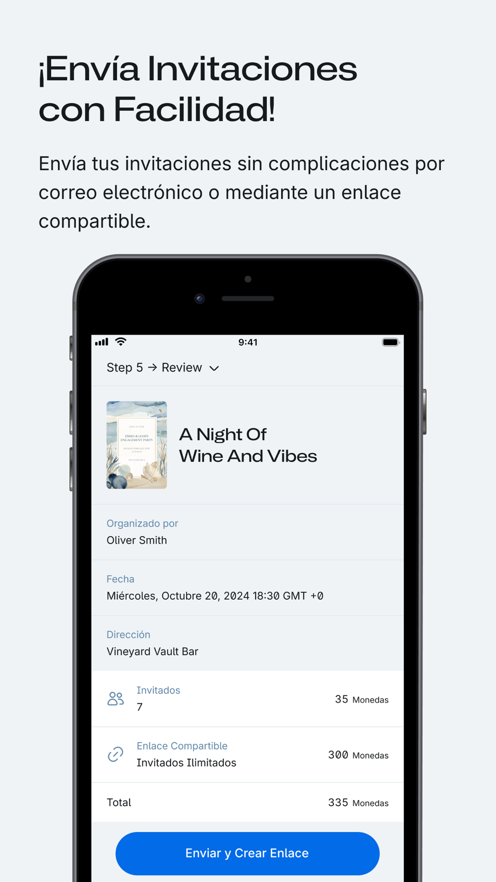 Comparte tus invitaciones por correo electrónico directamente desde la aplicación.
