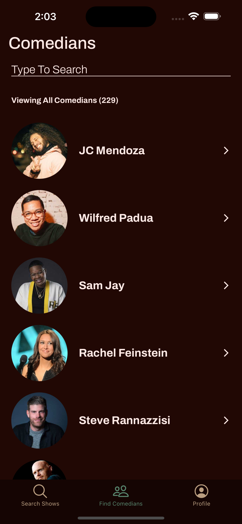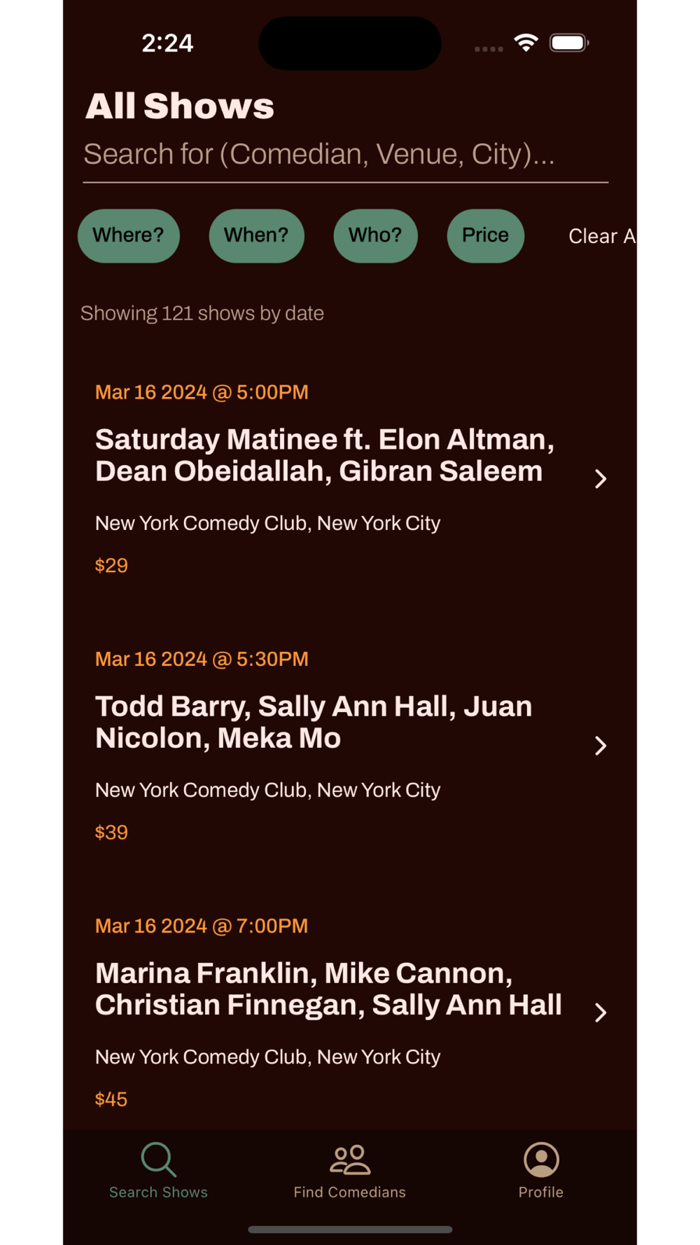 Version 1.0 tracks shows from a few venues in New York City. We are working to expand the number of shows we feature in NYC, the cities you can find shows in, and the number of comedians searchable on the app.