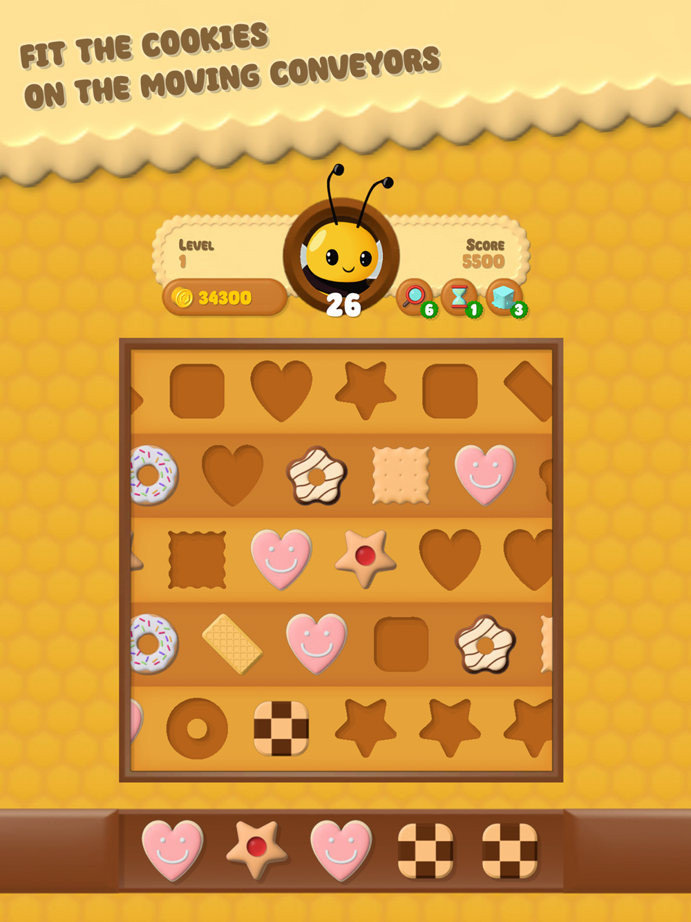 Help the bee with the constantly moving conveyors and fit the biscuits perfectly.