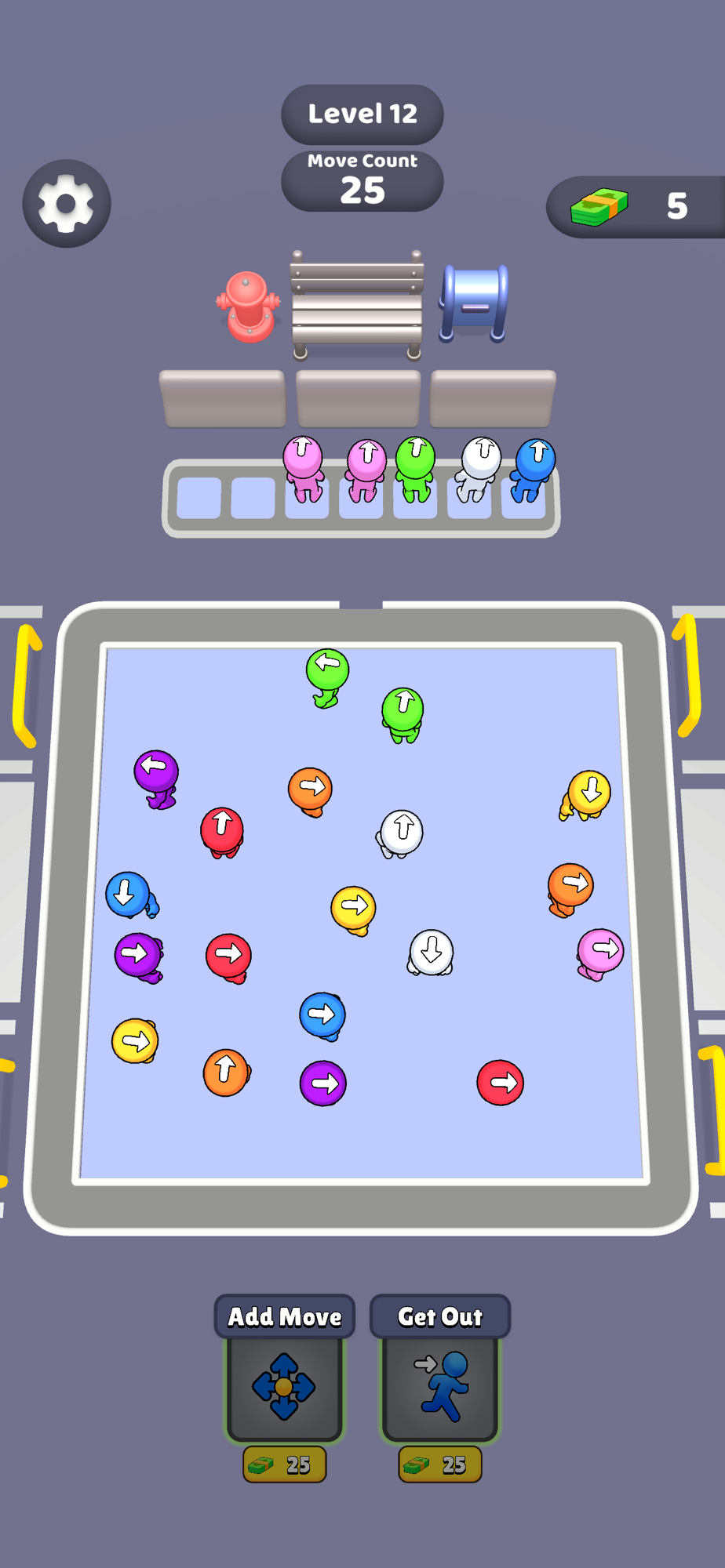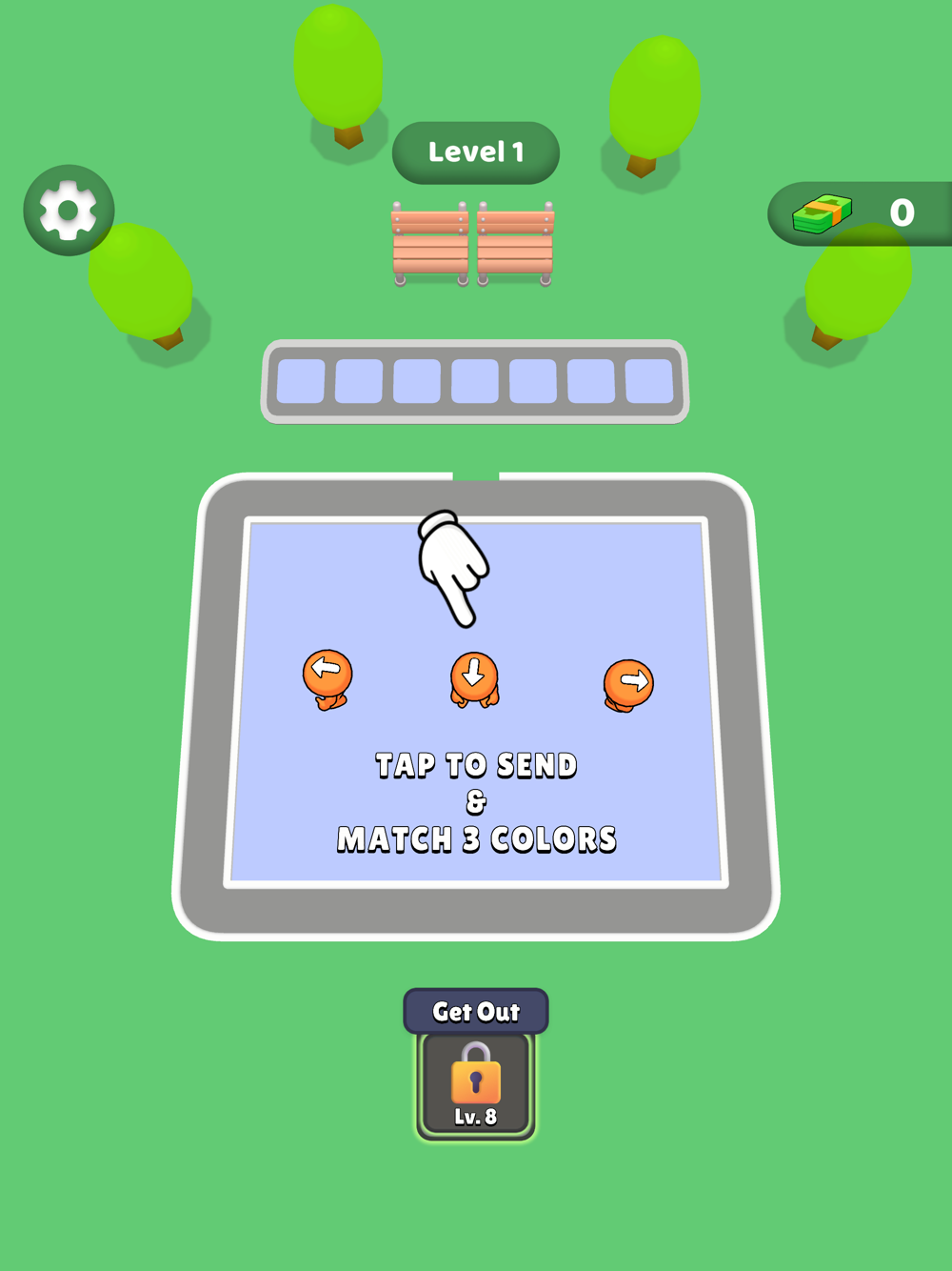 It's time to disperse the crowd! Tap the characters to send them on the road according to their directions. Match same three colors to make space on the waiting area! Be careful not to bump them to each other!