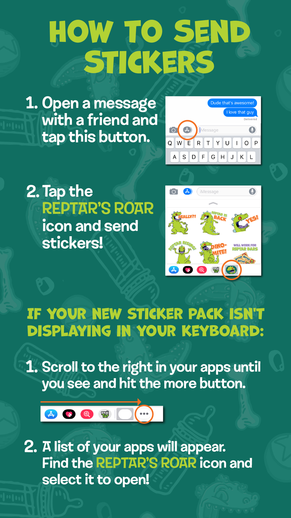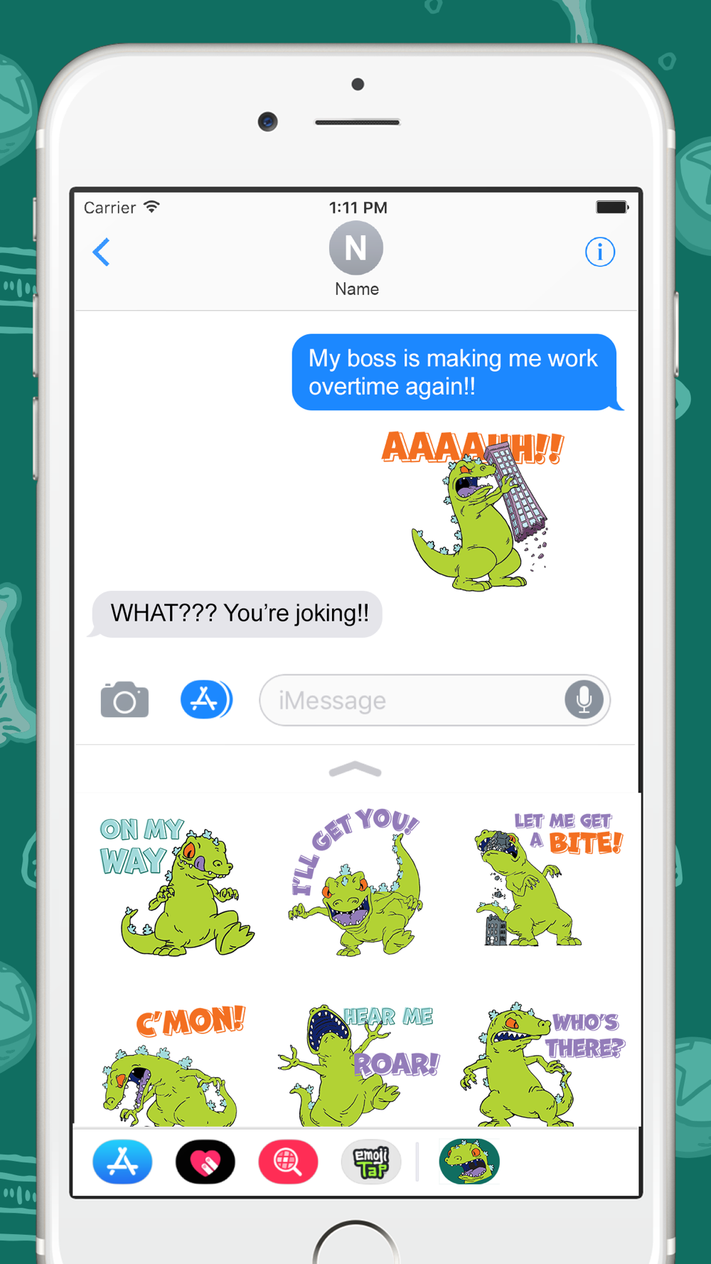 This messaging sticker pack features a delightful collection of static stickers inspired by the iconic character Reptar from the beloved children's animated television series, Rugrats. Each sticker captures the essence of Reptar's larger-than-life personality and brings a nostalgic touch to your conversations.