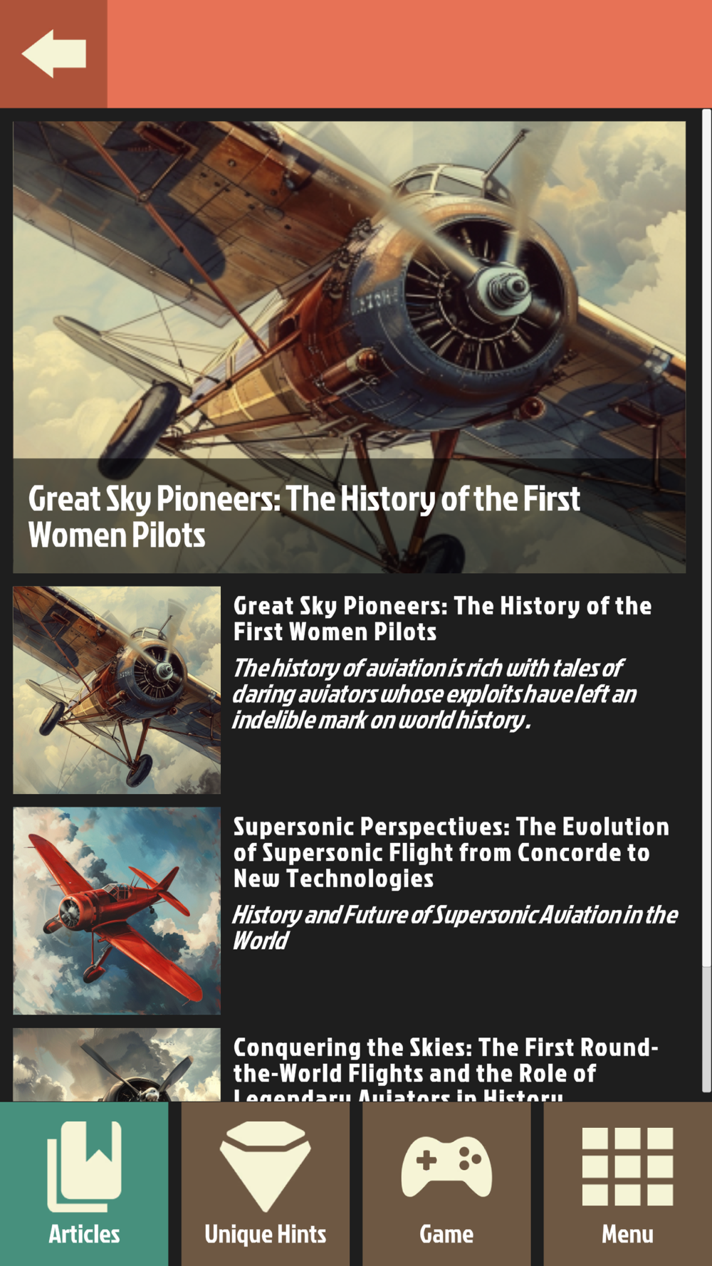 Immerse yourself in the captivating world of aviation with the "Plane Knowledge App". It's a comprehensive guide that offers an extensive database of articles about airplanes, their history, and technical specifications, while also allowing you to dive into the exciting atmosphere of flight through an engaging mini-game. Learn about various airplane models from classical to modern, explore key moments in aviation history, and discover fascinating facts that animate this captivating world.