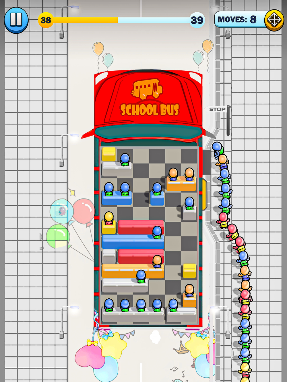 School Bus Seat Sort Puzzle game filled with excitement and strategy as you tackle increasingly challenging levels of seat sorting puzzles. Use your problem-solving skills to strategically move passengers around, unblocking jammed seats and creating a smooth flow of movement throughout the bus. All passengers are eagerly waiting to find their right seats based on color. Can you navigate through the jam-packed bus and unblock the seats to ensure everyone finds their spot?