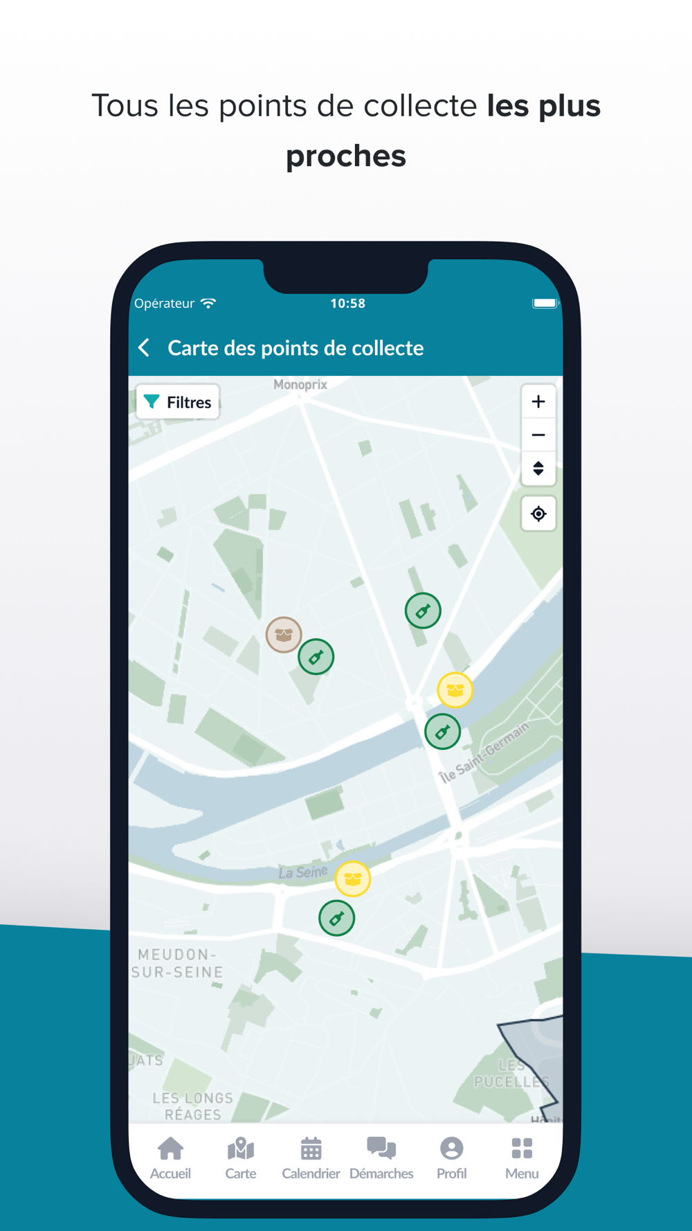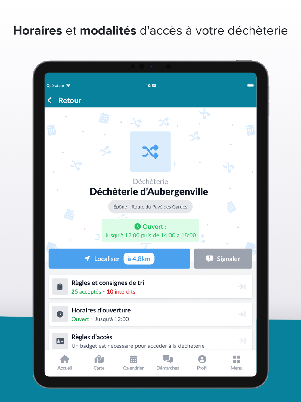 Vous y trouverez toutes les infos utiles au tri et à la réduction de vos déchets, personnalisées à votre adresse : planning de collecte, position et disponibilité des bornes de collecte de proximité, horaires et informations pratiques sur les déchèteries, consignes de tri et bien plus encore. Recevez des notifications de rappel de sortie de vos bacs, des alertes d’actualités ou infos sur les nouveautés, mais également des conseils, trucs et astuces pour réduire vos déchets !