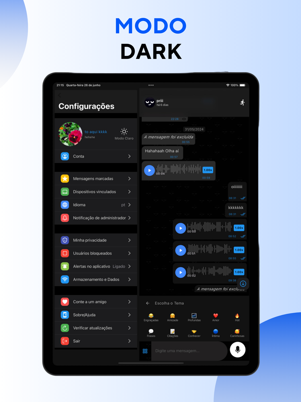 Gravação de Voz: Envie mensagens de voz quando precisar se expressar melhor ou quando estiver em movimento.