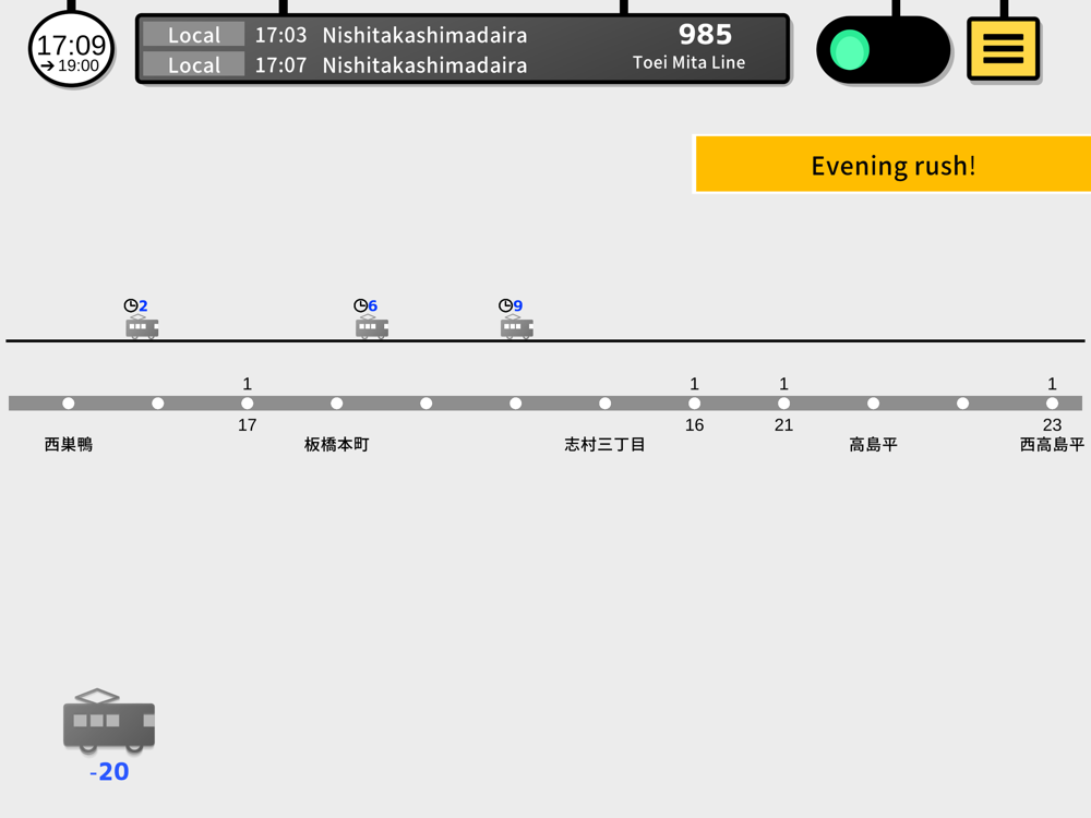In this game, the theme is the evening rush hour in Japan. Transport your customers from terminal stations to stations in commuter towns. We have also made it possible to enjoy separate routes for Tokyo, Nagoya, Osaka, and Fukuoka, so you can play from the route of your choice.