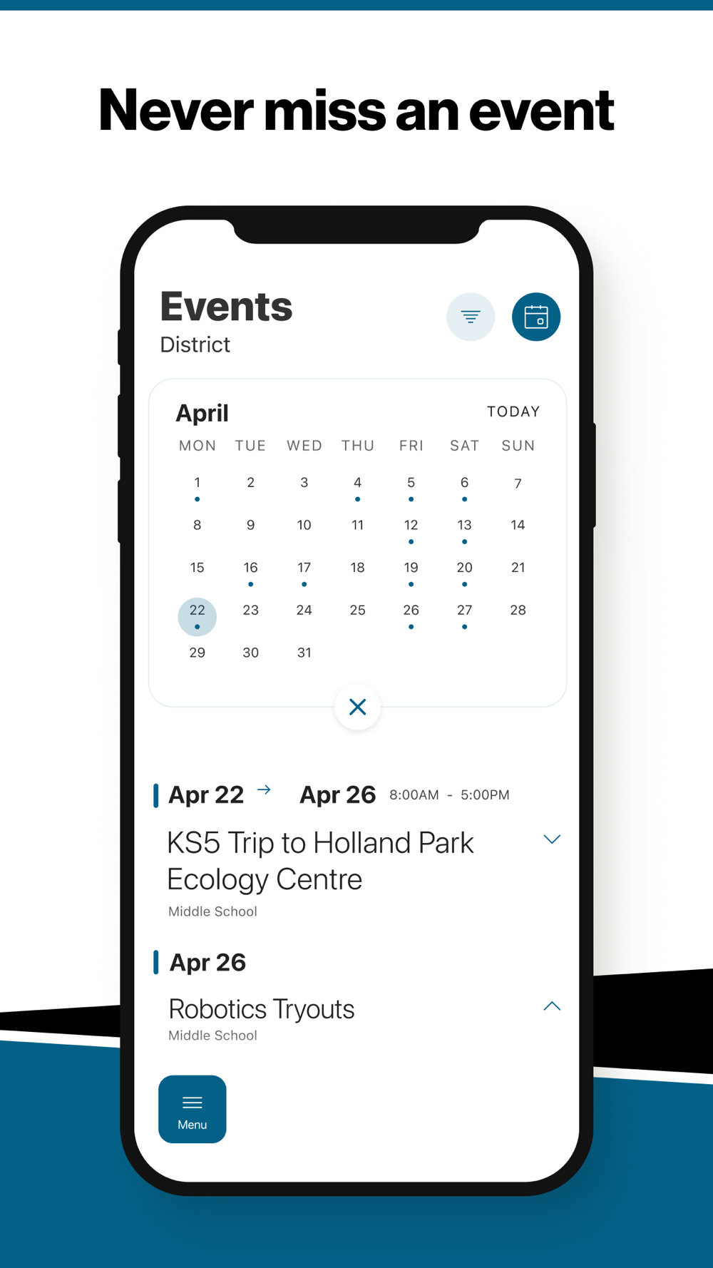 The event section shows a list of events throughout the district. Users can add an event to their calendar and share the event with friends and family with one tap.