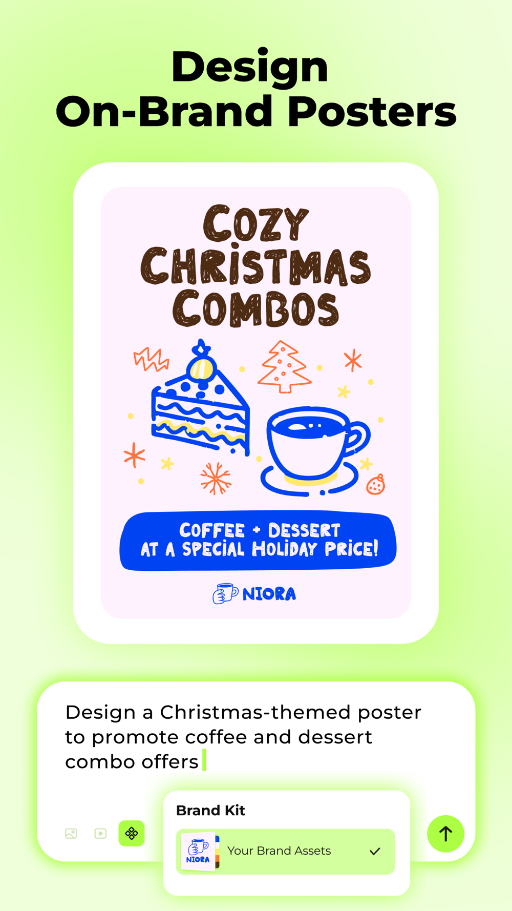 - Market in seconds: Create seasonal promotions, launch posters, menus, and digital campaigns—all in your brand style.