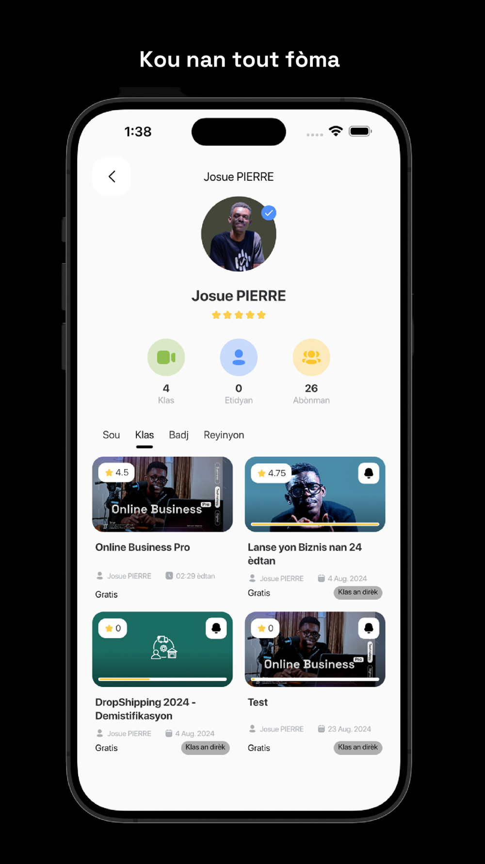 Nou pèmèt Enstitisyon edikatif yo, tankou lekòl ak inivèsite genyen yon espas sou platfòm lan pou fòme pwòp etidyan yo. Yo kappa ajoute pwofesè, kreye klas, jere pwogrè etidyan yo, epi bay sipò konplè nan yon espas dedye pou bezwen enstitisyon yo a.