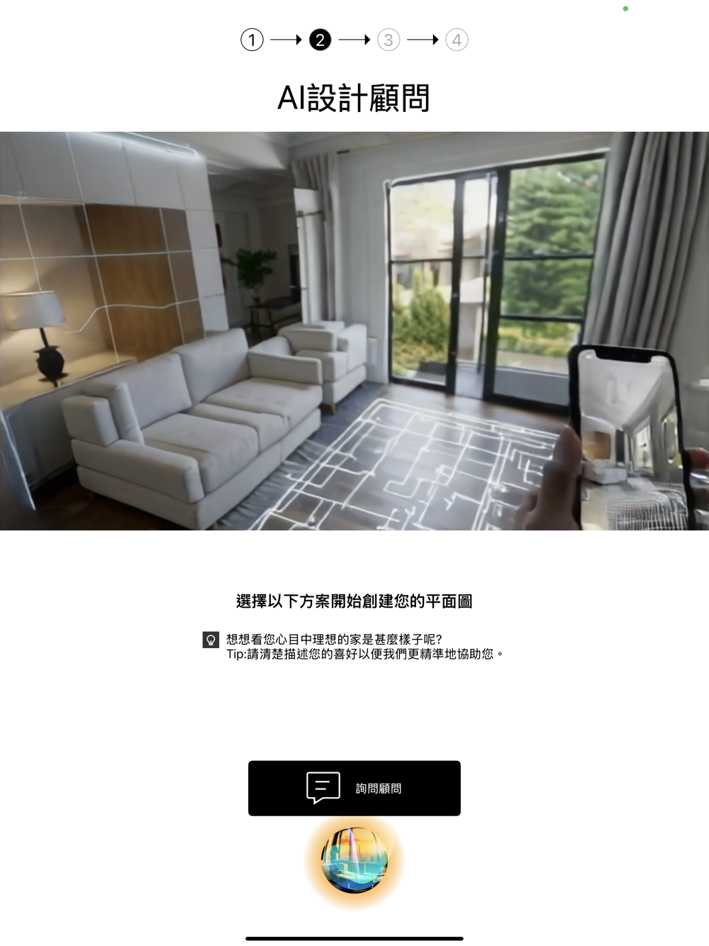 掃描空間 – 使用手機掃描室內環境,AI 將自動建立 3D 模型,讓您即時預覽裝潢效果。