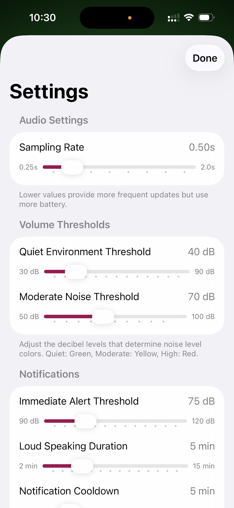 • **Real-Time Monitoring**: See your current sound level in decibels with color-coded visual feedback (green for quiet, yellow for moderate, red for high)
