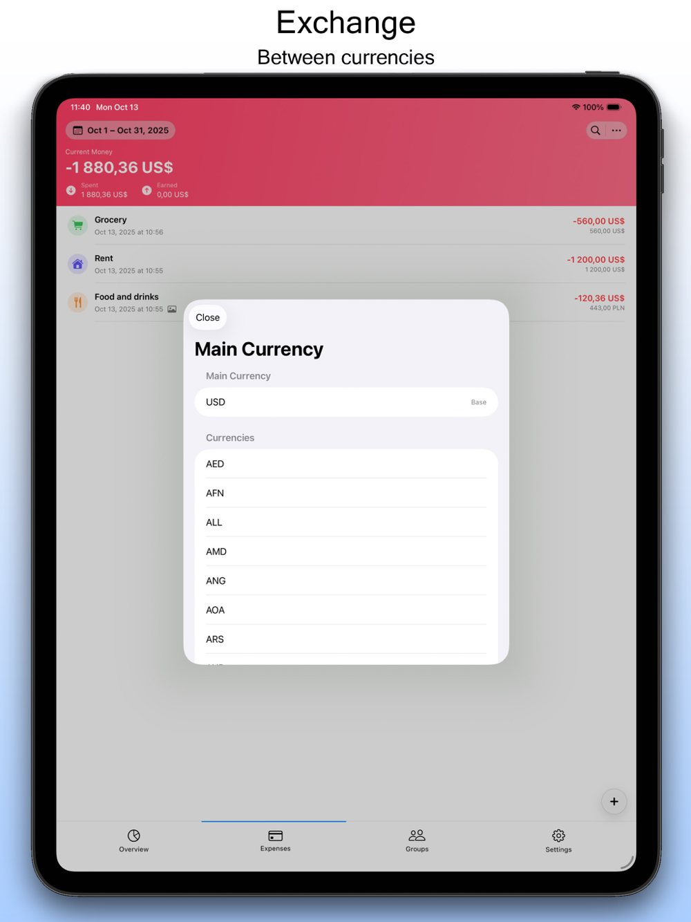 Choose your main currency and record expenses or incomes in any currency. Each transaction shows the original currency, exchange rate at the time, and conversion to your main currency.